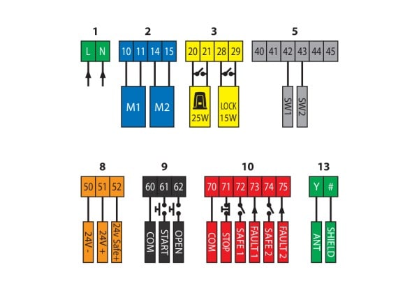 Armoire de commande pour 1 ou 2 opérateurs 24V pour la motorisation de portails battants Alimentation carte : 230V monophasé Alimentation opérateurs : 24 Vcc 180 W maxi pour chaque opérateur