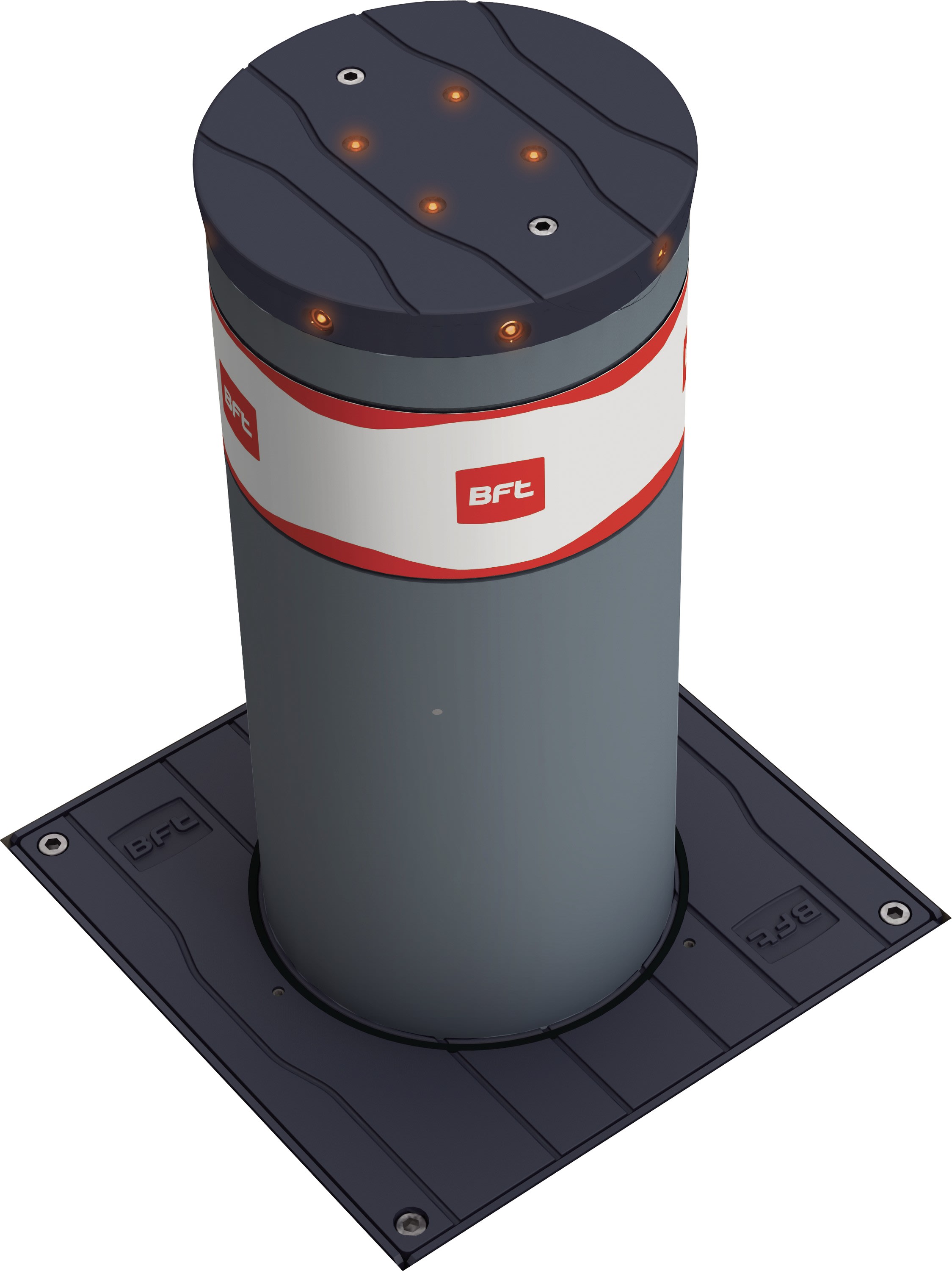 Borne escamotable de dissuasion électromécanique avec caisson de coffrage, avec fût de 490 mm de hauteur et 219 mm de diamètre. Résistance aux chocs 10500 J.