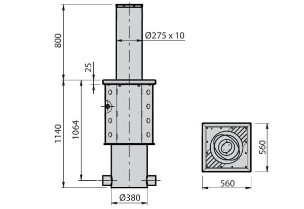 Borne escamotable anti-terrorisme hydraulique K4 230 V. Fût de 800 mm de hauteur et 273 mm de diamètre, avec feux à LED dans le chapeau. En cas de panne de courant, le cylindre ou fût continue à barrer l'accès.Caisson de coffrage inclus.