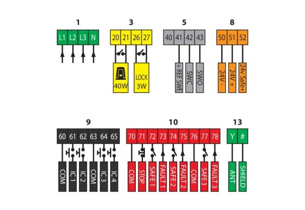 Carte de commande pour 1 opérateur 230/400 V TRI pour la motorisation de portails coulissants Alimentation carte : 230/400 V TRI . Refermeture automatique, commandes ouvre et ferme séparées Récepteur radio non fourni
