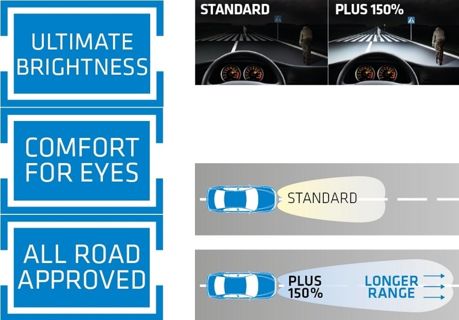 La gamme de lampes halogènes pour phares PLUS 150% dépassent les limites. Elles ont été conçues pour donner 2 fois plus de lumière que les ampoules classiques. Une portée plus importante et un faisceau concentré offre un meilleur niveau d'éclairement,