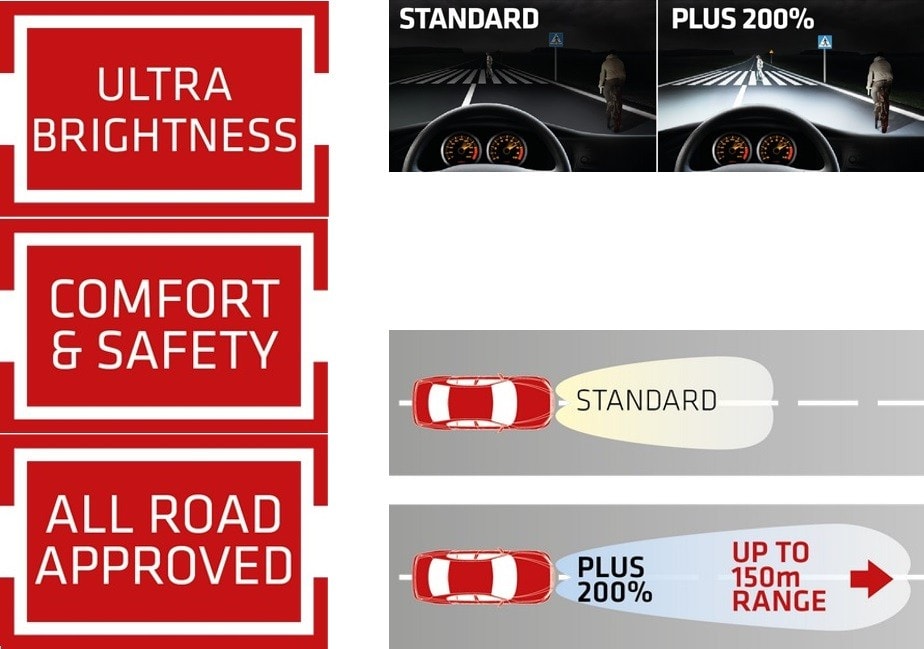 Les lampes halogènes pour phares PLUS 200% MEGA LIGHT ont un look moderne et améliore le confort de conduite. Une visibilité excellente, 200% plus élevée que les ampoules classiques, qui permet une meilleure anticipation face aux dangers potentiels,