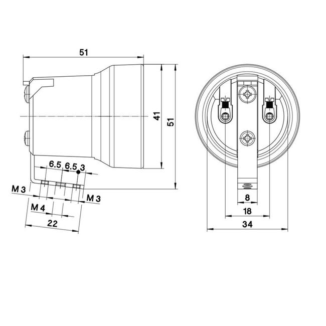 Une douille en porcelaine E27 avec support coudé et vis de mise à la terre. Cette lampe convient à une tension nominale jusqu'à 500V, une portée jusqu'à 5kV et une température de 180?C. Le support métallique a deux trous M3 et un trou central fileté M4.