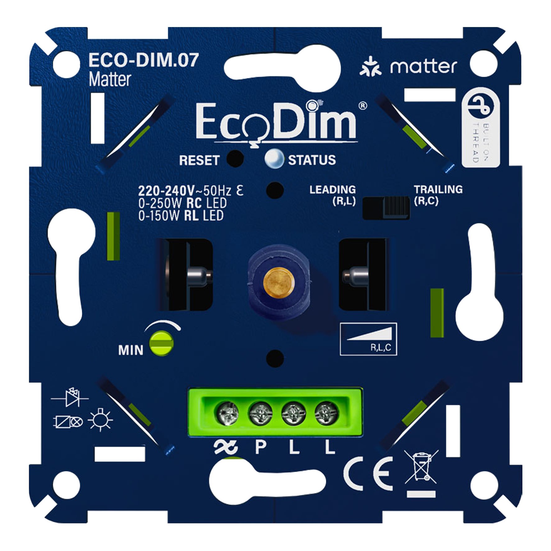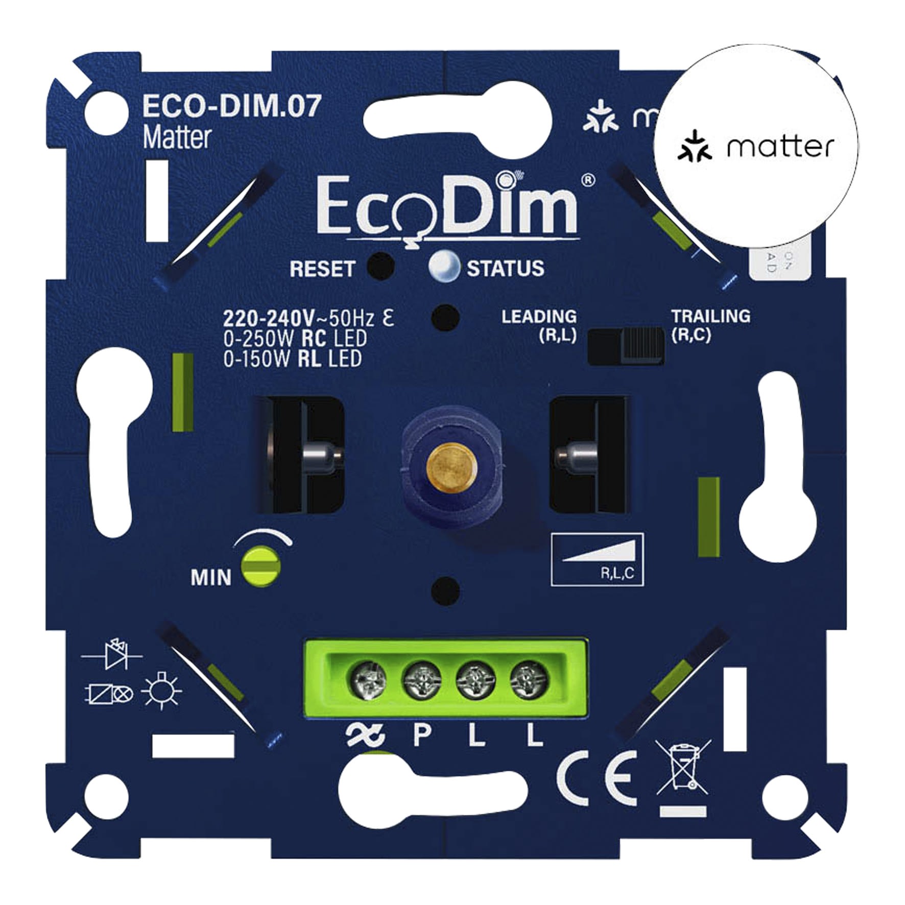 L'ECO-DIM.07 Matter est un variateur LED d'une puissance LED 0-250W. Le variateur convient aux deux techniques de gradation (phase montante et descendante) et dispose d'un réglage MIN et d'une détection automatique MAX. Le variateur LED peut être