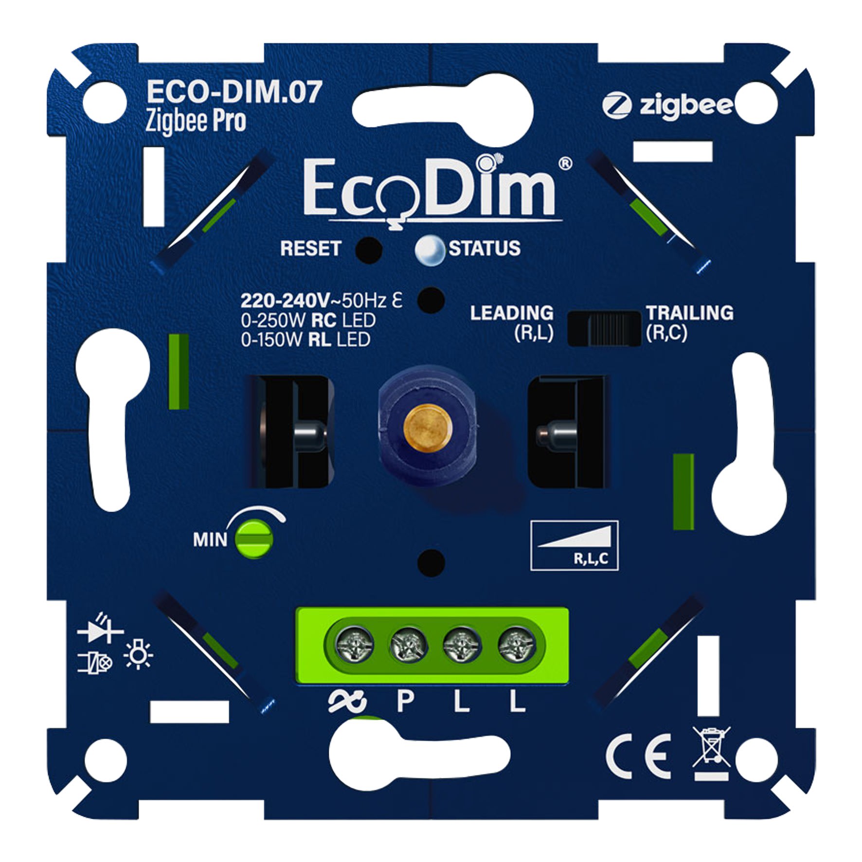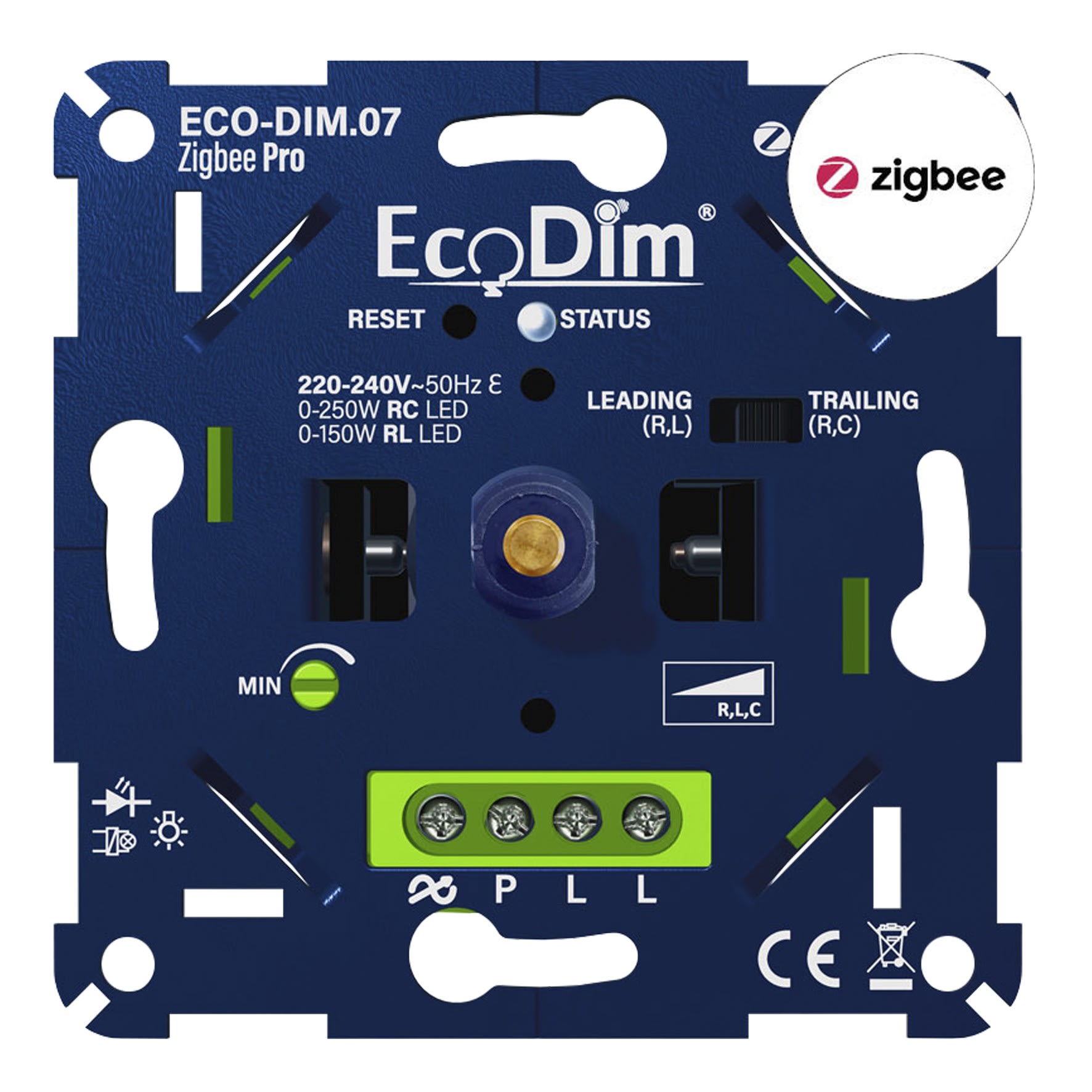 Le variateur ECO-DIM.07 Zigbee Pro est un variateur LED d'une capacité de 0 à 250 W LED. Le variateur convient aux deux techniques de gradation (avance de phase et coupure de phase) et dispose d'un réglage MIN et d'une détection MAX automatique. Le
