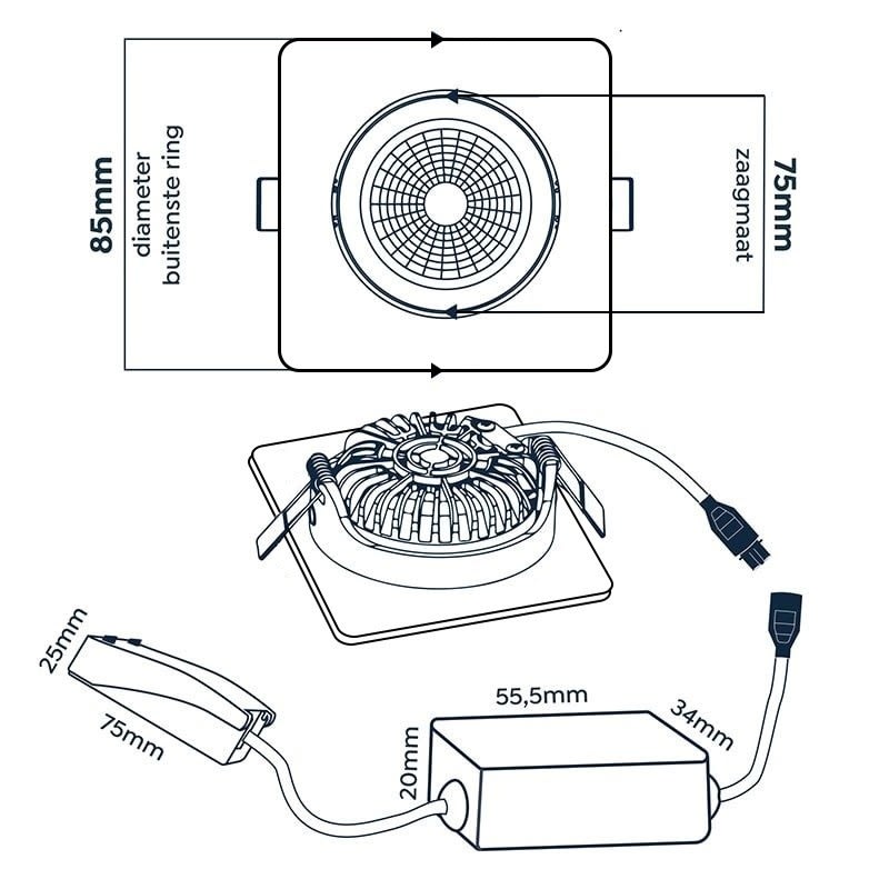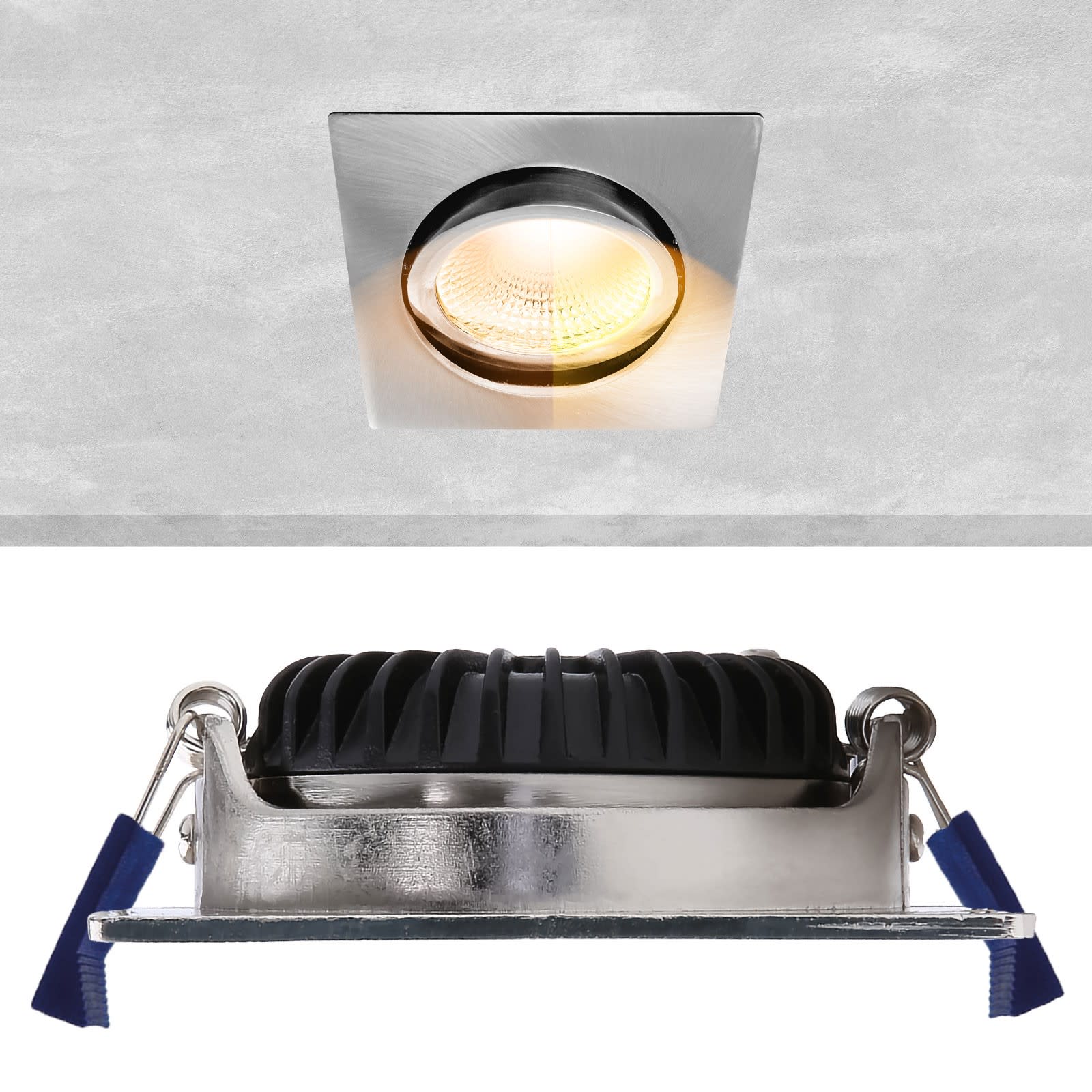 Spot encastrable LED. Dimmable à 5%, Petite profondeur d'installation 23 mm, IP54 : Résistant aux éclaboussures, Convient pour la salle de bain, Pivotant, Faisceau lumineux 60°. Driver inclus. La boîte de jonction avec connecteur à double pince est