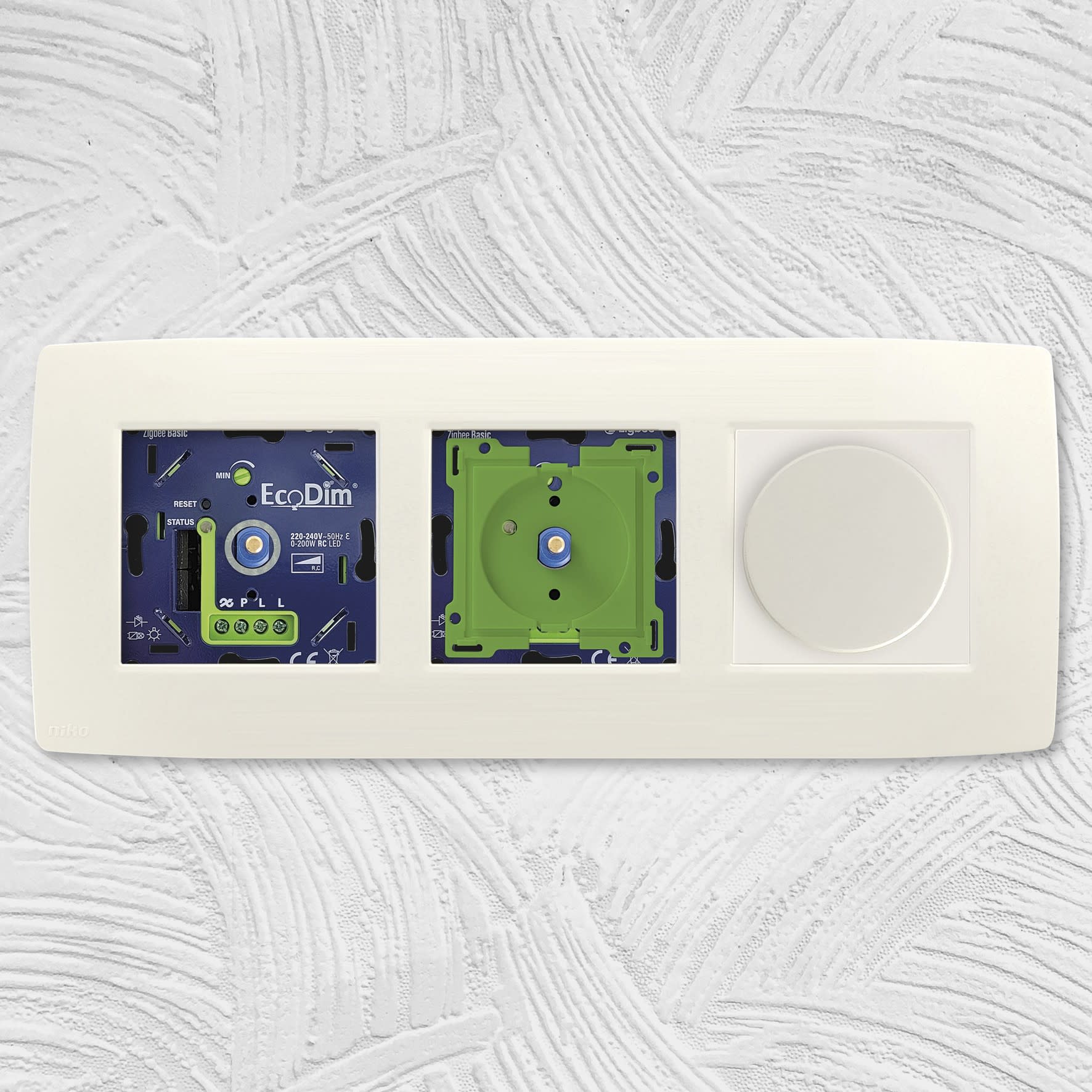 Par défaut, tous les variateurs EcoDim (carrés) sont compatibles avec les plaques de finition xxx-31000 de marque NIKO. Grâce à ce kit d'adaptation, les variateurs pourront aussi être utilisés avec la gamme Niko xxx-31003. Cela fait d'EcoDim la première