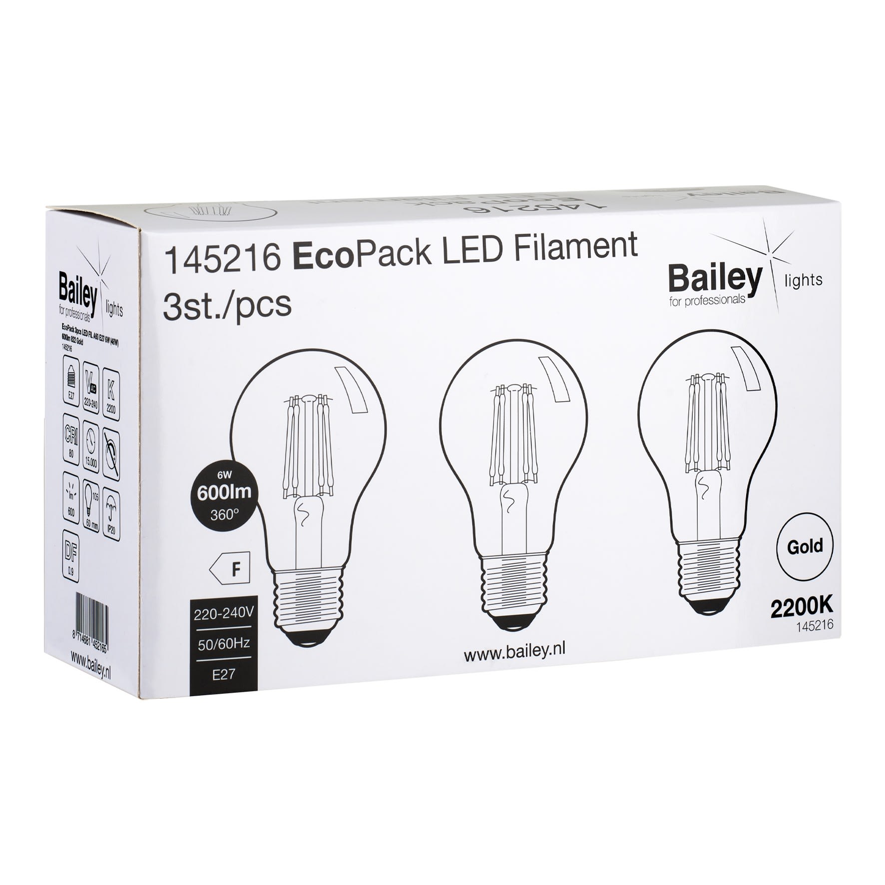 Bailey - EcoPack 3pcs LED Filament Standard A60 E27 6W 2200K Or 600lm (48W) 230V-240V - 145216