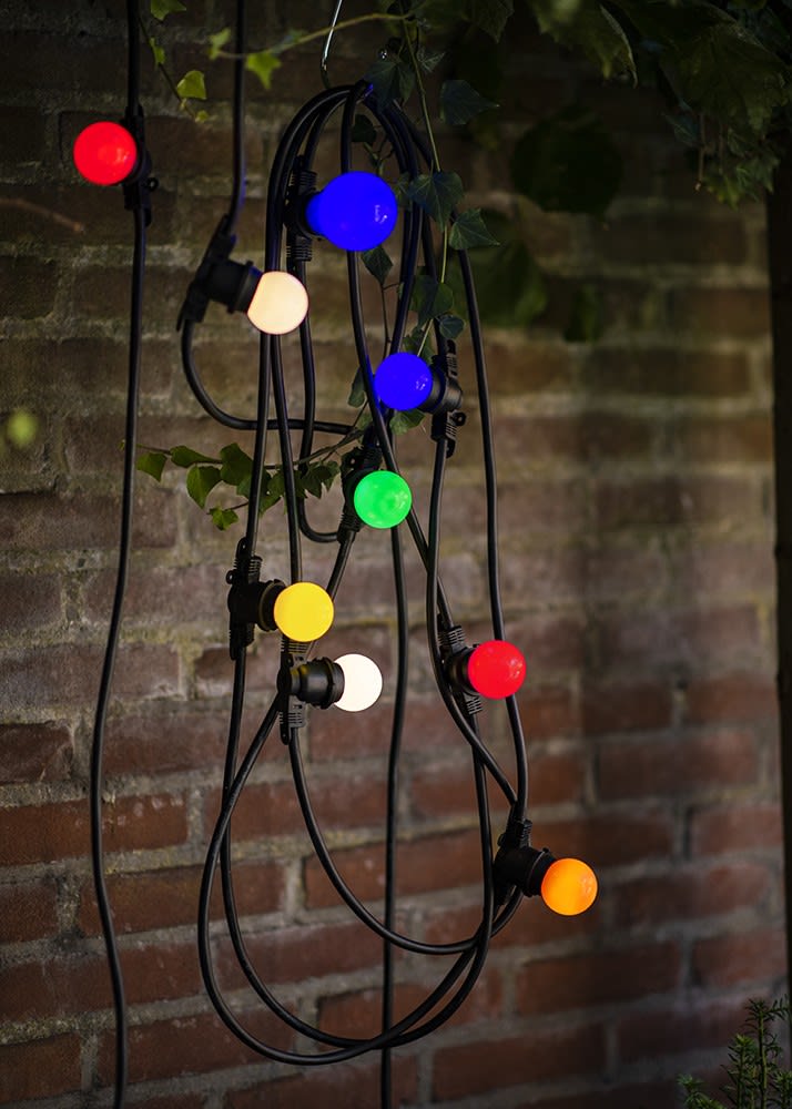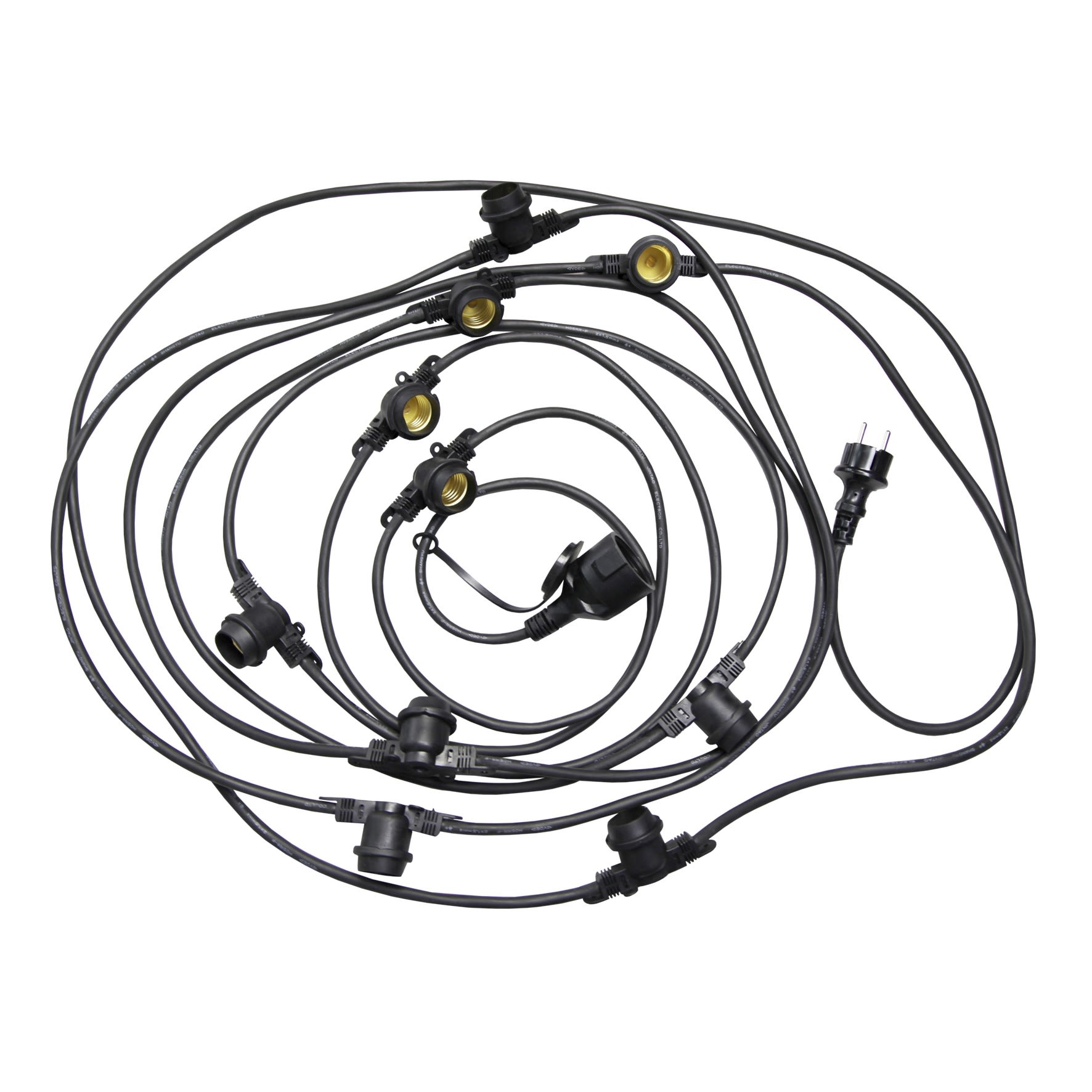 Guirlande de 10M, prêt à l'emploi avec 10 douilles E27 (distance ± 0,8M),avec fiche, une prise et embout. Sans lampes. Idéal pour les fêtes d'anniversaires, lors de festivals, sur les terrasses, fêtes du vin, parcs d'attractions ou pour d'autres