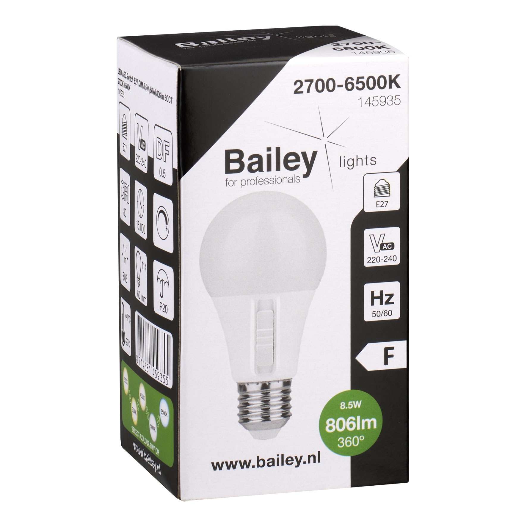 Bailey - LED A60 Switch E27 8.5W (60W) 806lm Gradable 5CCT 2700K-3000K-4000K-5000K-6500K - 145935