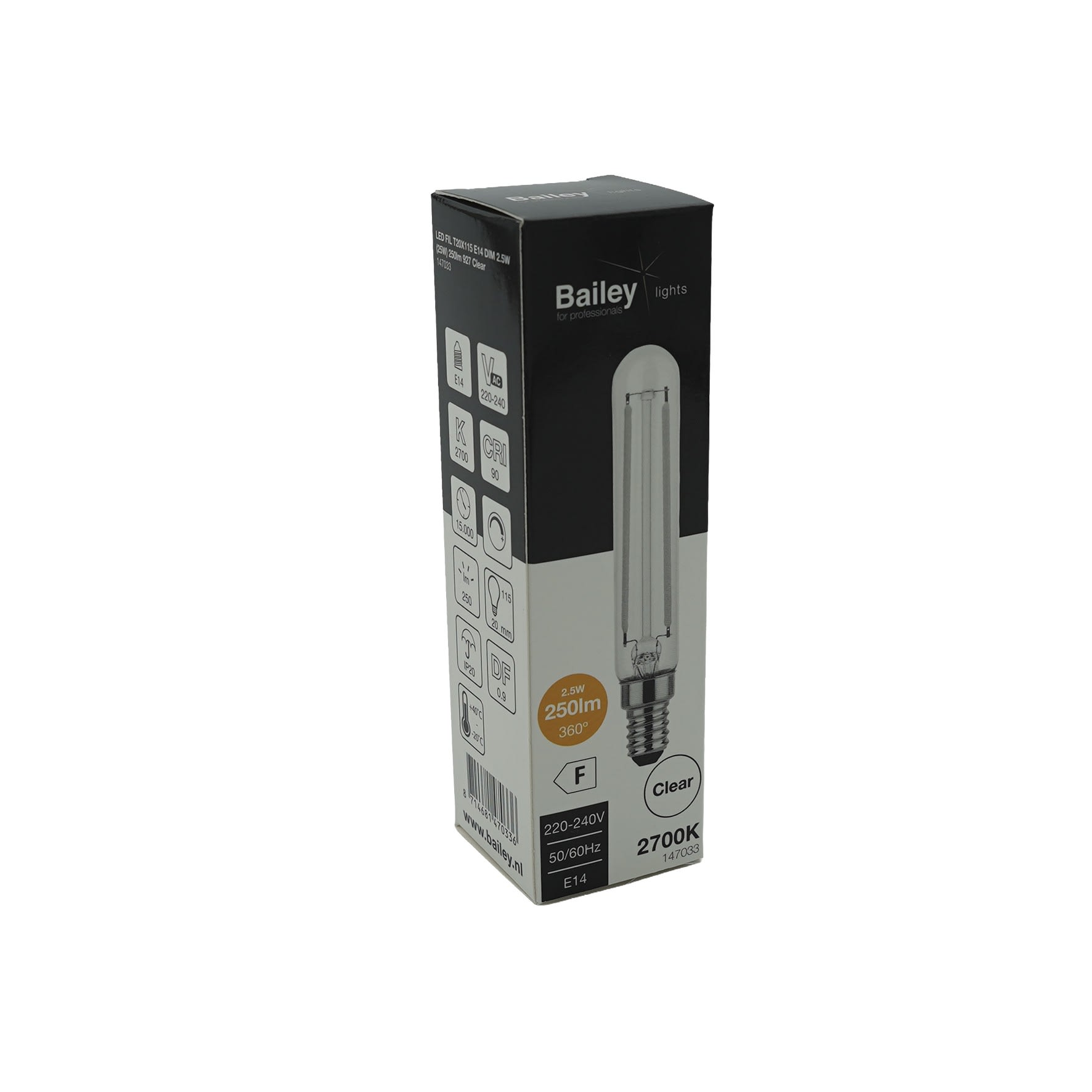 Bailey - LED Filament Tube T20 E14 2.5W 250lm (25W) 2700K IRC90 Gradable 230V 20x115mm - 147033