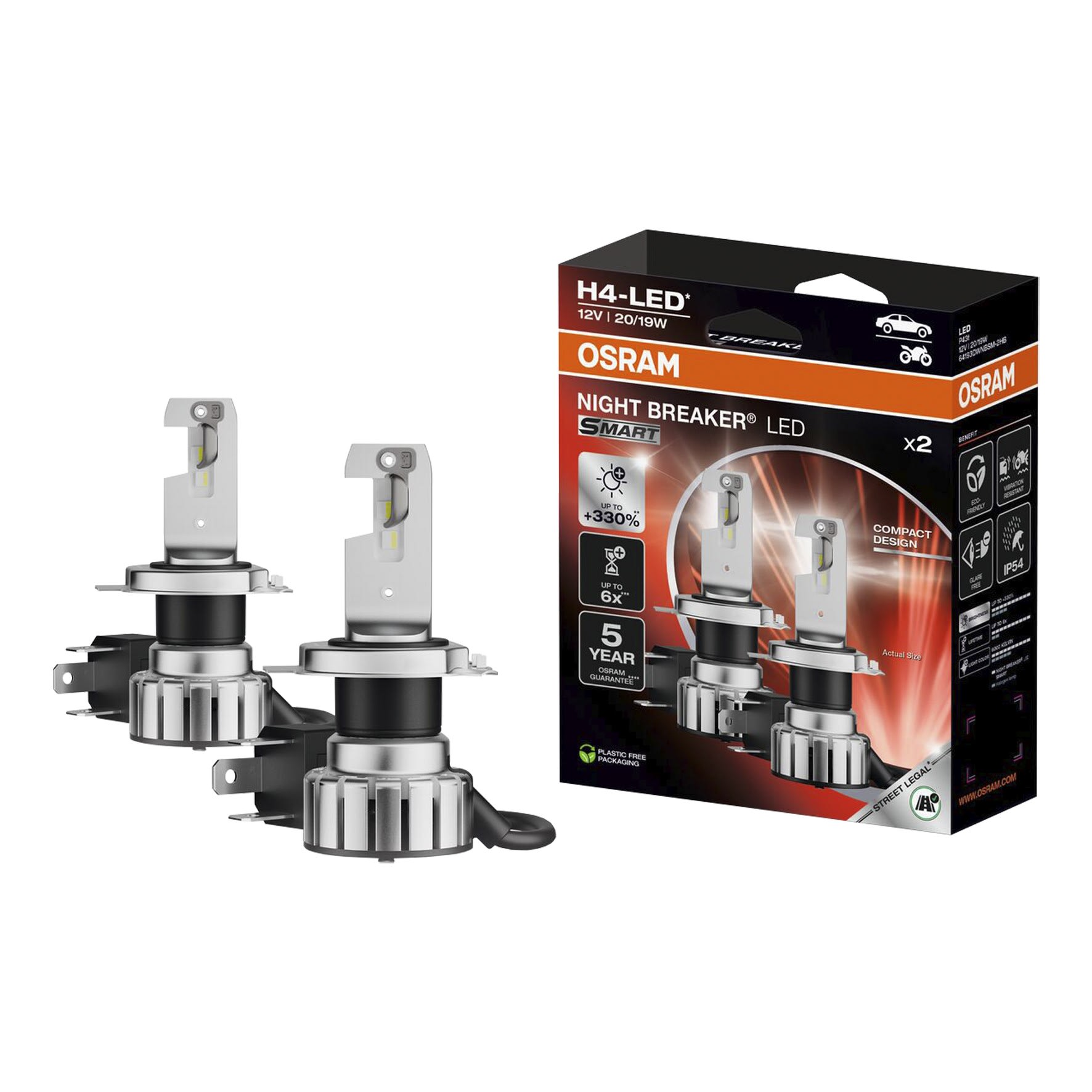 Grâce au modèle NIGHT BREAKER H4-LED, fabriqué par OSRAM, la première lampe LED homologuée* pour usage routier est maintenant disponible. C'est une lampe "plug-and-play", directement connectable, qui offre aux conducteurs des avantages significatifs :