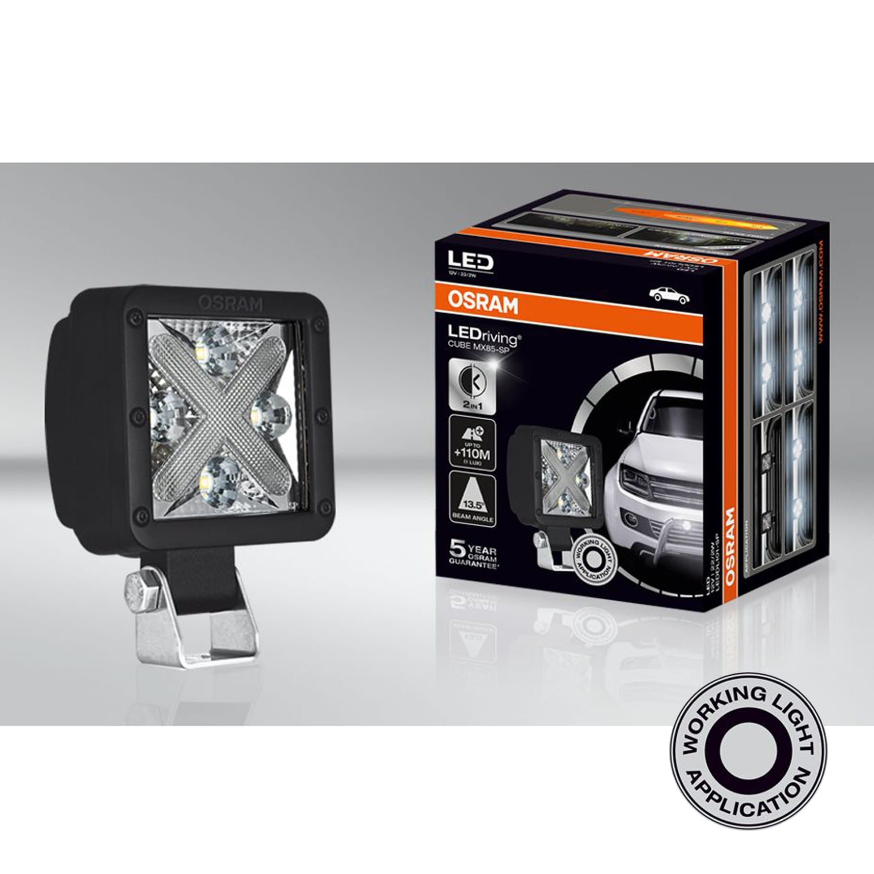 Technologie fiable et éclairage intense en champ lointain: le feu de route LEDriving Cube MX85-SP LED réunit sans effort les deux. Avec quatre LED puissantes, le projecteur de travail atteint une distance de lumière allant jusqu'à 110 mètres. La lampe