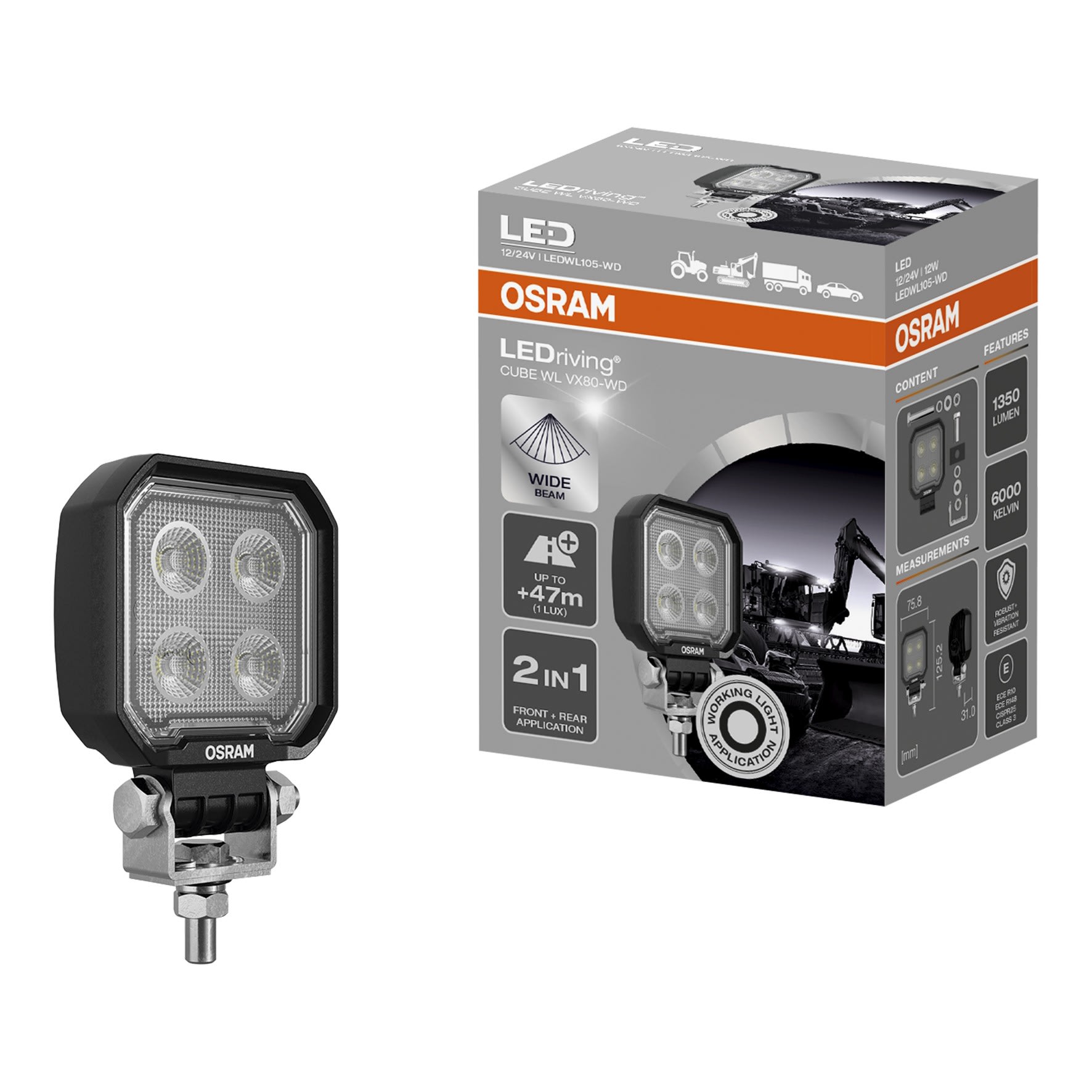 Grâce au projecteur pour véhicules LEDriving Cube WL VX80-WD, vous obtenez un éclairage impressionnant sur les chantiers, dans les carrières, champs, sentiers forestiers, en dehors des voies de circulations publiques éclairées. Ce projecteur de travail