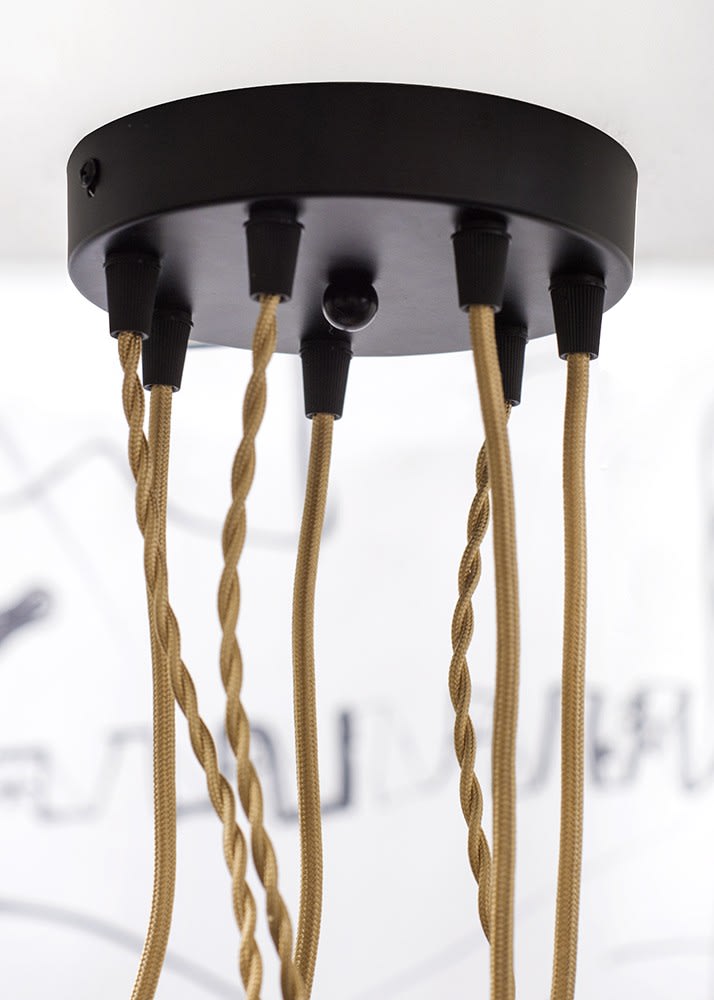 Rosace de plafond en métal orné pour le montage de lampes et de luminaires au plafond. Adaptée pour 7 câbles. Avec serre-câble et vis de montage.