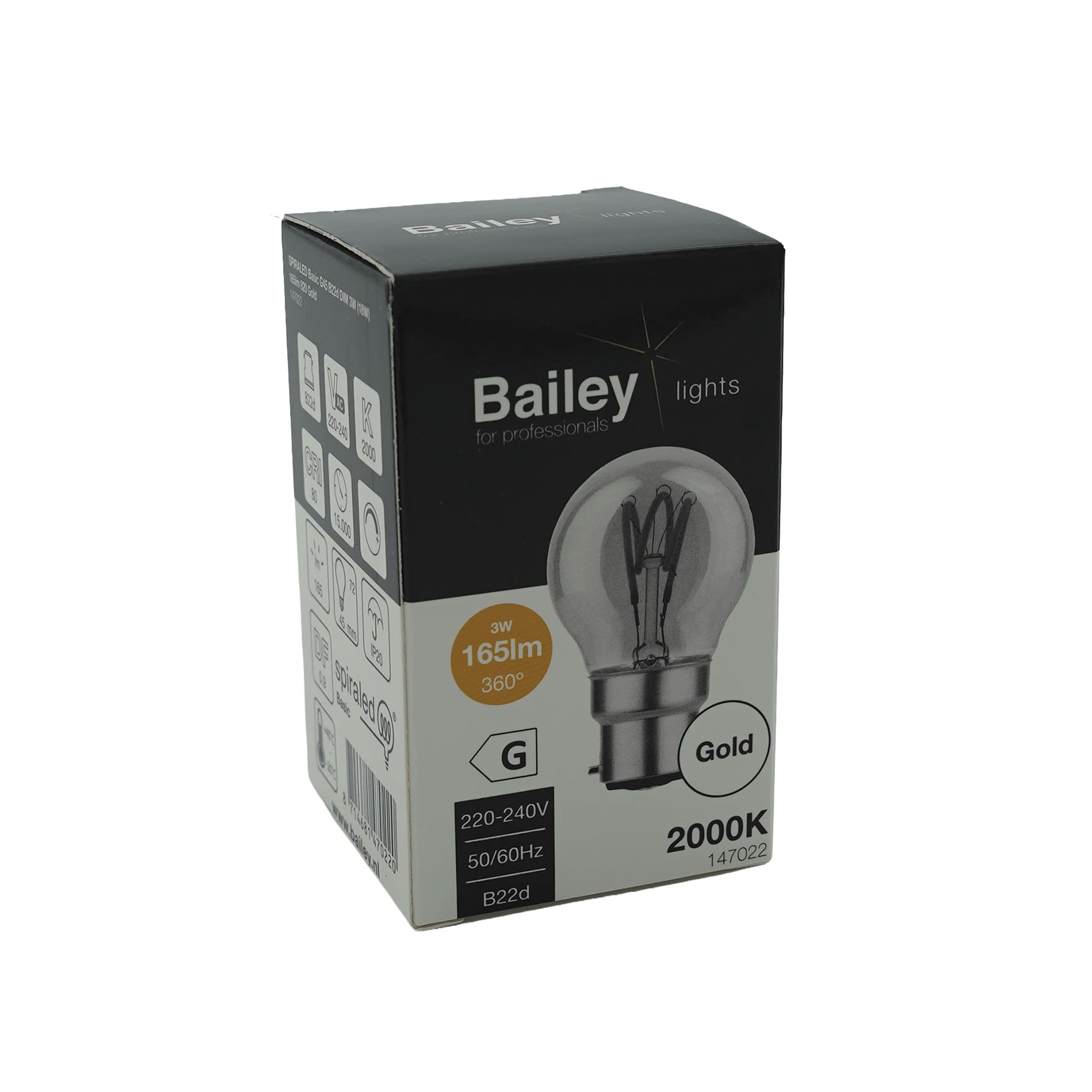 Bailey - Spiraled Basic Sphérique G45 B22d 3W 2000K Or 165lm (18W) Gradable 230V-240V - 147022