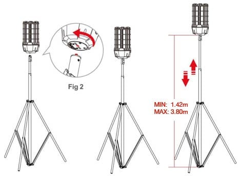 Le trépied Robust en aluminium est un accessoire au Robust LED Corn Switch (#146544). La Led Corn est fermement fixée sur le trépied grâce au boulon M10. La hauteur est réglable de 142cm à 380cm. Les pieds sont également réglables. Il est conseillé de