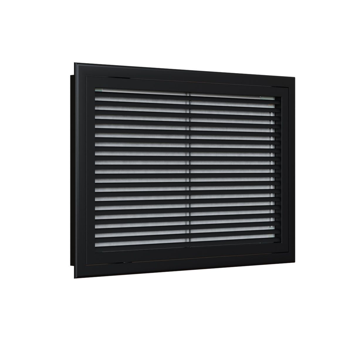 Grille de reprise porte-filtre à ailettes droites en aluminium époxy noir mat RAL9005 de 600x400 mm - cadre à bord arrondi - avec filtre qualité G3 - débit d'air : 900 m3/h