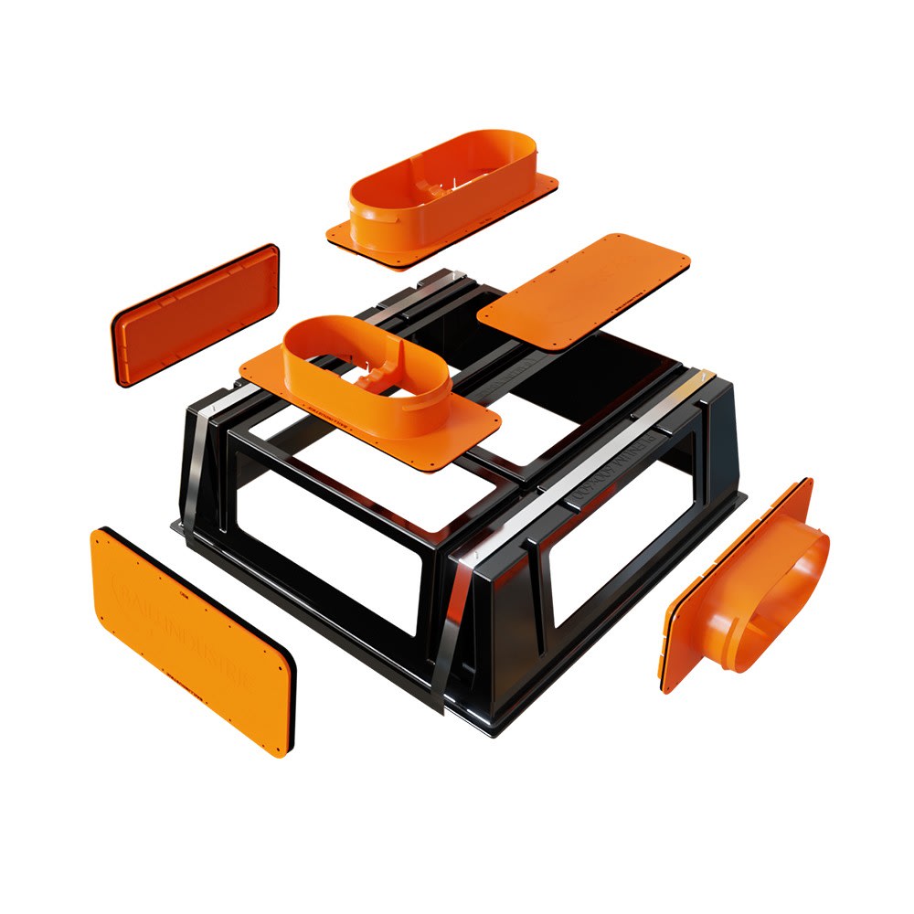 Plénum modulable de 600x600 mm comprenant 2 piquages de diamètre 200 mm + 1 piquage de diamètre 250 mm + 3 obturateurs