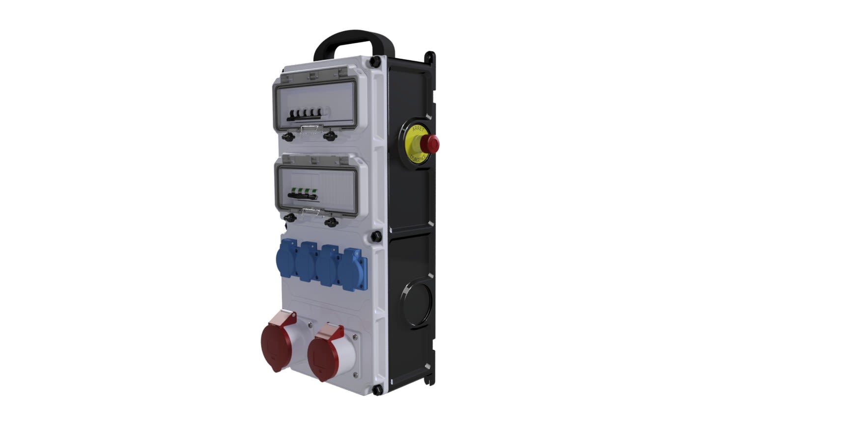 Coffret de chantier avec poignée équipé de :1 Disj diff 4P 32A 30mA en tête1 AU sur bobine MX1 PC 5P 32A 400V-NF EN 60309-1 et 2 1 PC 5P 16A 400V–NF EN 60309-1 et 2 – 1 Disj 4P 16A3 PC 2P+T 10/16A 230V NF USE - NF C 61314 - 1 DPN 16A C