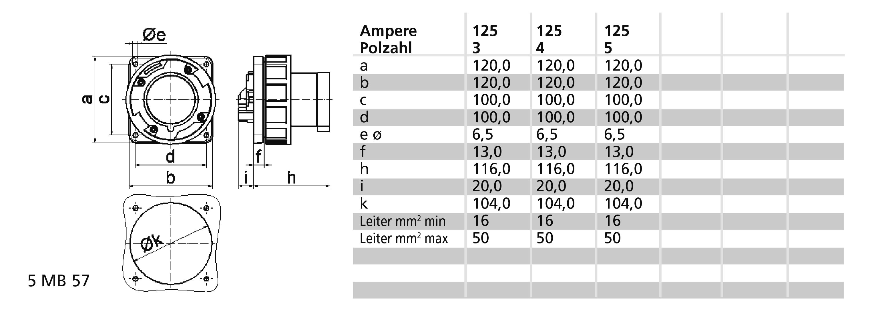 N° art. BALS: 2876EAN: 4024941028769s.connecteur plastron TE droit 125A 5p (3P+N+PE) 400V(200/346 à 240/415V) 6h IP67, Fréquence: 50 et 60Hz, Codecouleur: rouge RAL 3000, Contacts: le porte-contacts est enmatériau résistant à la chaleur, les contacts sont en laitonnickelé, Section maximale des conducteurs: 50,0 mm²,Matériau du boîtier: polyamide, Connectique: bornes à visen bornes à cage, Entrée de câble: autre, Couleur del’appareil: collet rouge RAL 3000, anneau baïonnette grisRAL7035, boîtier gris RAL 7035, Hauteur de l'appareil enmm: 125 mm, Largeur de l'appareil en mm: 125 mm, Profondeurde l'appareil en mm: 143,5 mm, Dimension verticale duplastron en mm: 120 mm, Dimension horizontale du plastron enmm: 120 mm, Écartement vertical entre les trous de perçageen mm: 100 mm, Écartement horizontal entre les trous deperçage en mm: 100 mm, inverseur de phase: FALSE, Finitionmilitaire: FALSE, Autres caractéristiques techniques: colletau milieu du plastron