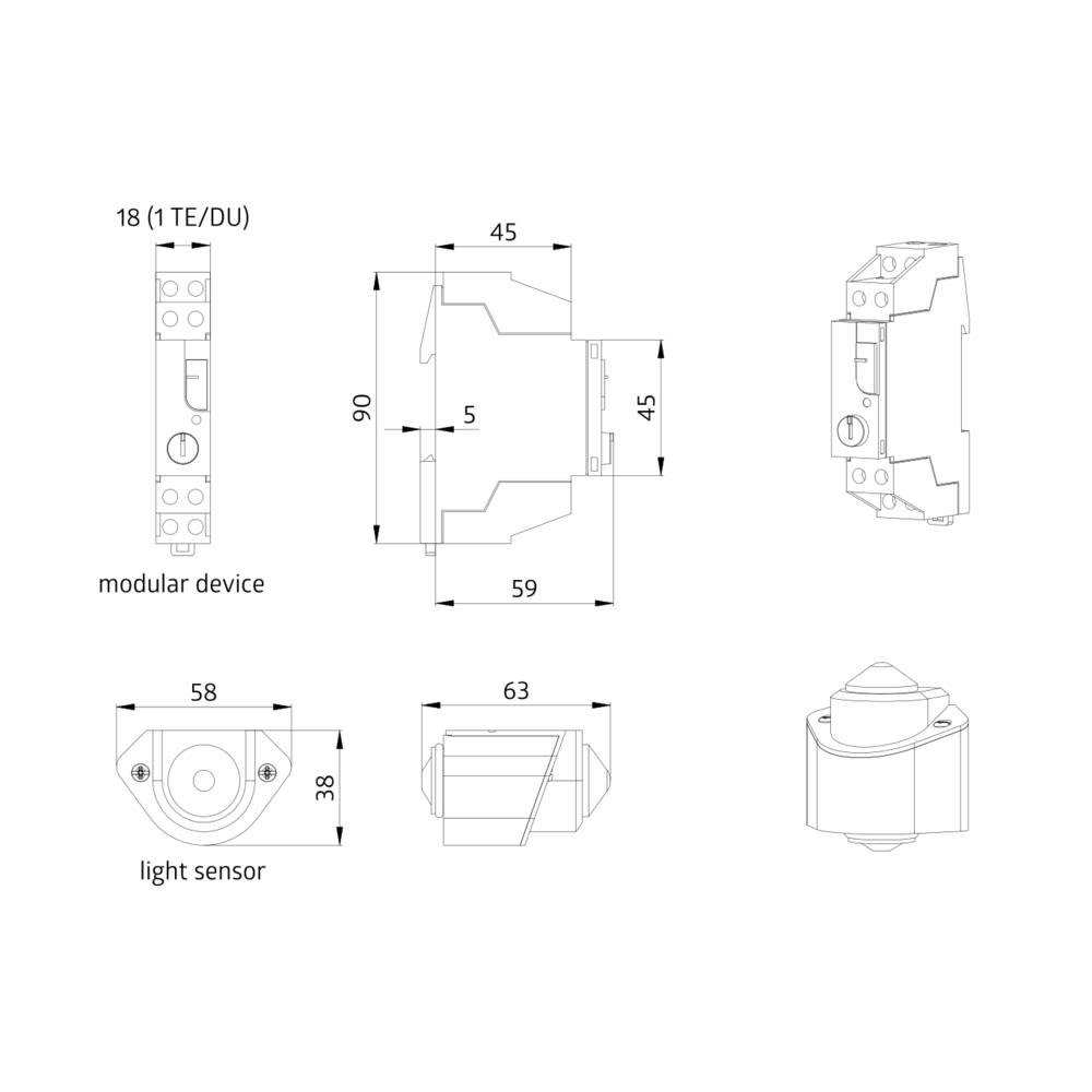 Interrupteur crépusculaire pour montage sur railAide de réglage par LED (sans temporisation) pour le seuil de réglage de déclenchementComposant électronique clipsable sur rail DIN pour des réglages confortables à partir de l'armoire de commandeCoupure