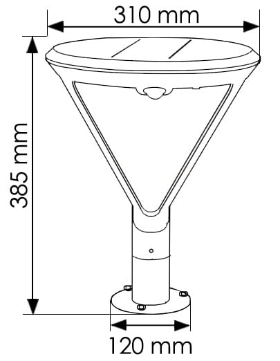 Borne solaire double détection IR - 3000°K - 2000Lm - Faisceau 360° - 2000Lm - Panneau solaire 6,5W - Batterie Li-ion 8000mAh/3,7V - IP65/IK10 - inclus éclairage + fixation sol + vis de fixation