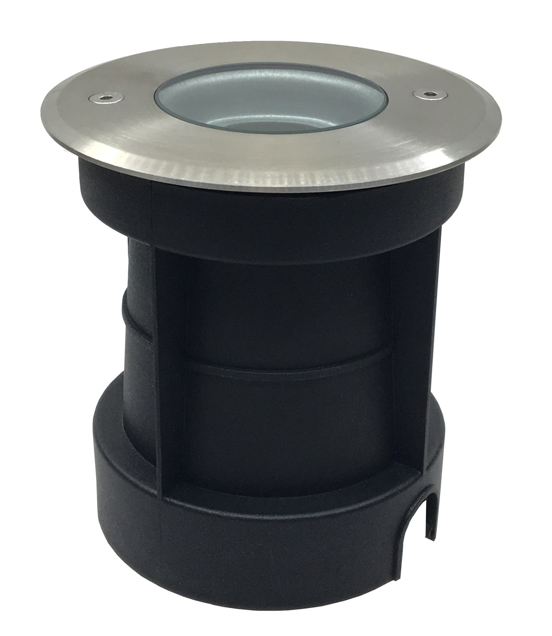 Encastré de sol Gardenia collerette inox 316L - IP65 - Orientable 15° - douille GU10 (AC230) et GU5.3(DC12V) incluses - Encastrement Ø102 mm - verre translucide et sable + pot d'encastrement inclus -Obturateur pour deuxième press-étoupe