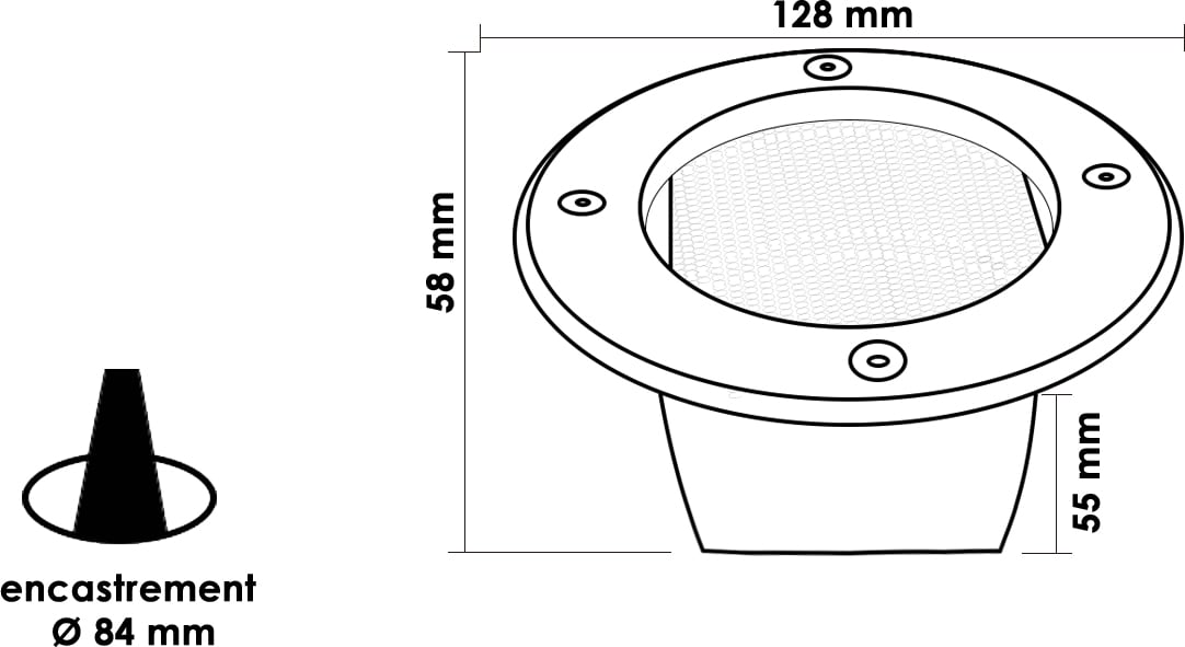 Encastré de sol/balisage solaire - 4000°K - Faisceau 120° - 20 Lumens - Panneau solaire 0,5 Watts - Batterie NI-MH-600mAh /1,2V - IP68 - Encastrement diam 4mm - Temps de charge 8 heures - Autonomie 8 heures - Résiste à 8T roulant
