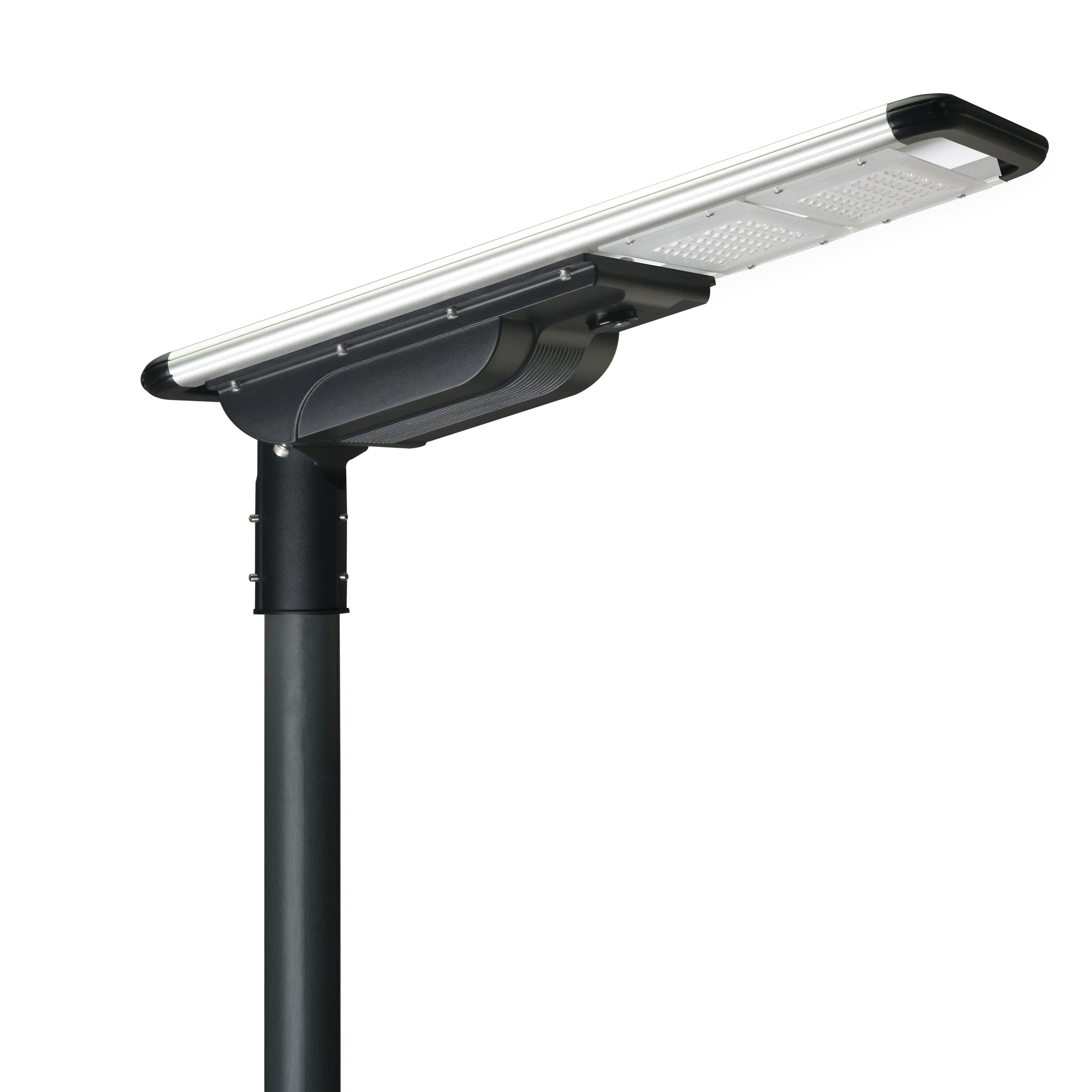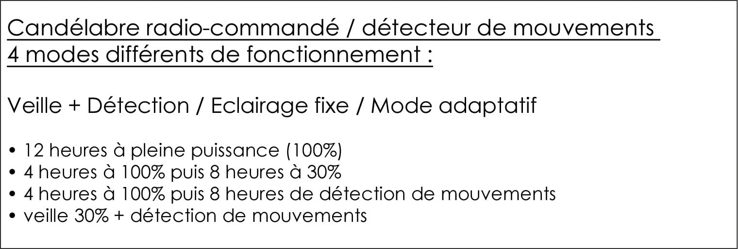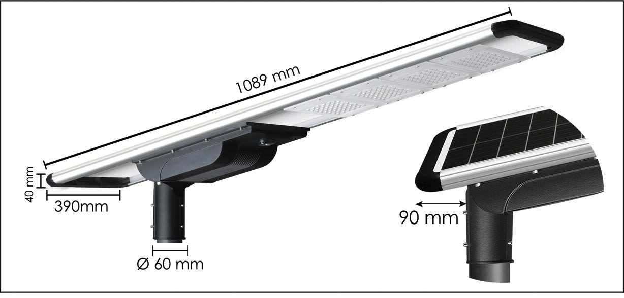 Tête de mât Atlas 60W à détection télécommandé - 3000°K - Faisceau asymétrique 140° latéral/70° longitudinal - 9000 Lm - IP65/IK09 - Panneau solaire 80W - Batterie LiFePO4 384 Wh/12,8V - Pour mât diam 60mm - Eclairage fixe/veille -4 modes