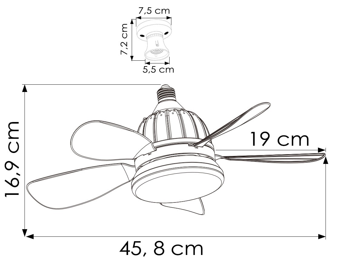Luminaire Ventilateur douille E27 - télécommandé - 3CCT 3000°K/4000°K/6500°K - 13W - 2000 Lm - adaptateur pour fixation directe et prolongateur inclus - Ventilateur 13W - 3 puissances - programmation 2h et 4h - surface 15m² - IP44