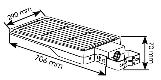 Projecteur/Lanterne solaire 40W télécommandé à détection de mouvements faisceau asymétrique 140°/70°- veille : 1440Lm - 100% : 6000Lm panneau solaire 21W - Batterie LiFePO41200mAh/9,6V Installation sur mât, latérale sur crosse ou murale