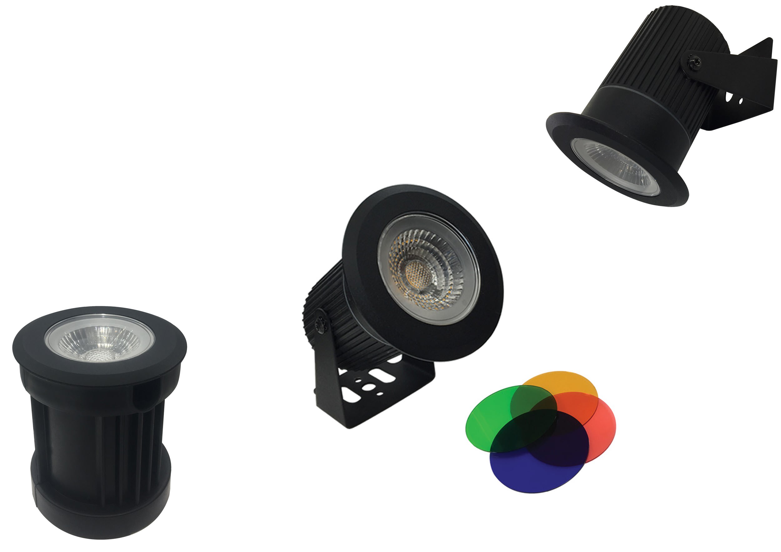 Spot 3EN1 10W-4000°K-1000lm-faisceau 60° - 4 Filtres couleurs inclus ambre/rouge/vert/bleu - installations : encastre de sol - fixation murale ou spot sur piquet - pot d'encastrement + pattes de fixations + collerette INOX inclus-IP67/IK07