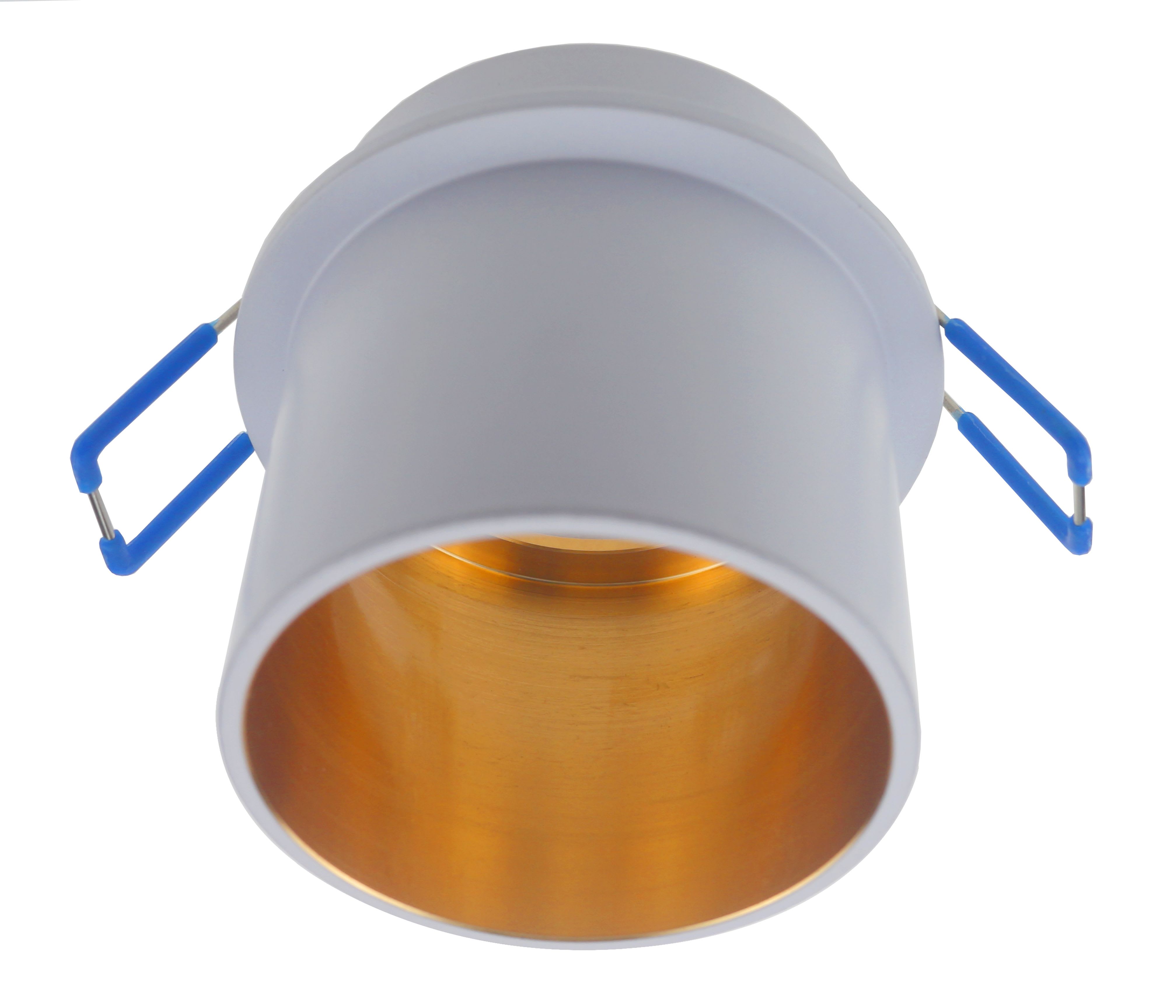 Spot GU10 Rond - Basse luminance (source en retrait) blanc mat + finition or - IP20 - non recouvrable - Douille et connecteur rapide inclus - Encastrement diam58mm/Recouvrement diam 70mm - Aluminium