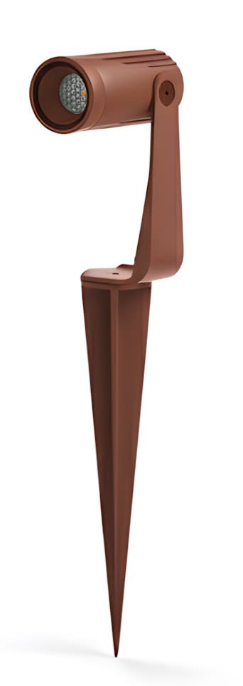 Spot sur piquet 10W - Basse luminance - 2700°K - 36° - 450 Lm -AC100/240V - optique nid d'abeille - câble 1m 3G0.75mm² fournis - portée 4 à 5 mètres - orientable à 180° - couleur corten/rouille - possibilité d'installation en saillie