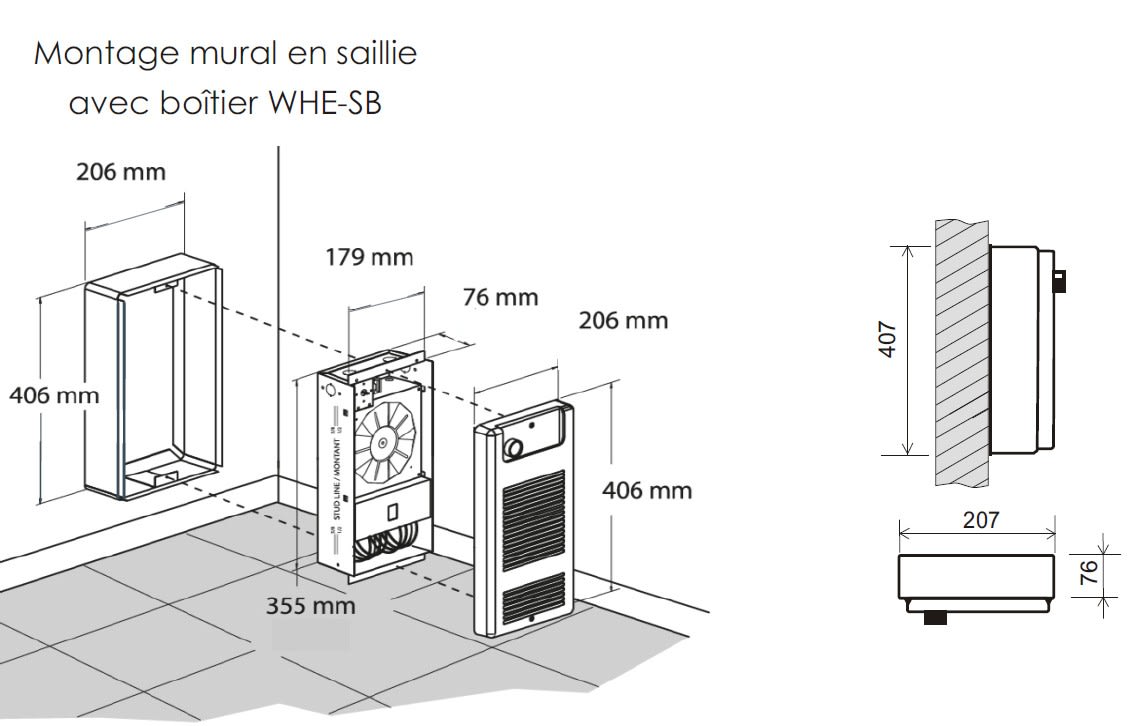 Ventilo convecteur encastrables de la gamme WHE sont particulièrement recommandés lorsque l’installation d’un chauffage nécessite une résistance mécanique importante et compacte.Montage mural, 2 possibilités ; encastré ou montage en saillie, avec boîtier montage en saillie réf. WHE-SB (option).Grande résistance mécanique IK10. IP23, 1500 et 2000 watts.Applications : Dans des espaces restreints tels que cabines de péage, cabines de grue, véhicules de chantier, cabanes de chantier ou constructions modulaires, hors gel/maintien température des petits stocks et annexes ainsi que les vestiaires d’usines, vestiaires de salles de sport, des écoles ou encore des cafés, brasseries et d’autres lieux, aux endroits où une grande résistance mécanique est souhaitée.