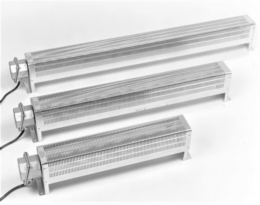 Radiateur ailettes avec grille de protection en acier et pieds. Boitier de raccordement en aluminium. 2000W 230V Dimensions : Longueur 1120 x largeur 91 x hauteur 150mm Poids 5.7kg Indice de protection IP66.