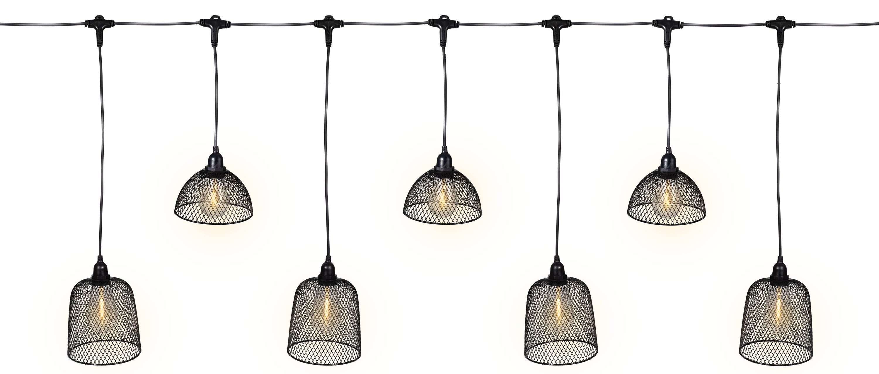 Guirlande déco avec 5 abat-jour métallique noir et crochet d'accroche-long 2,50 m, raccord 3x Taille abat-jour : dia 11,5 cm x H 12,5 cm et dia 12 cm x H 7 cm