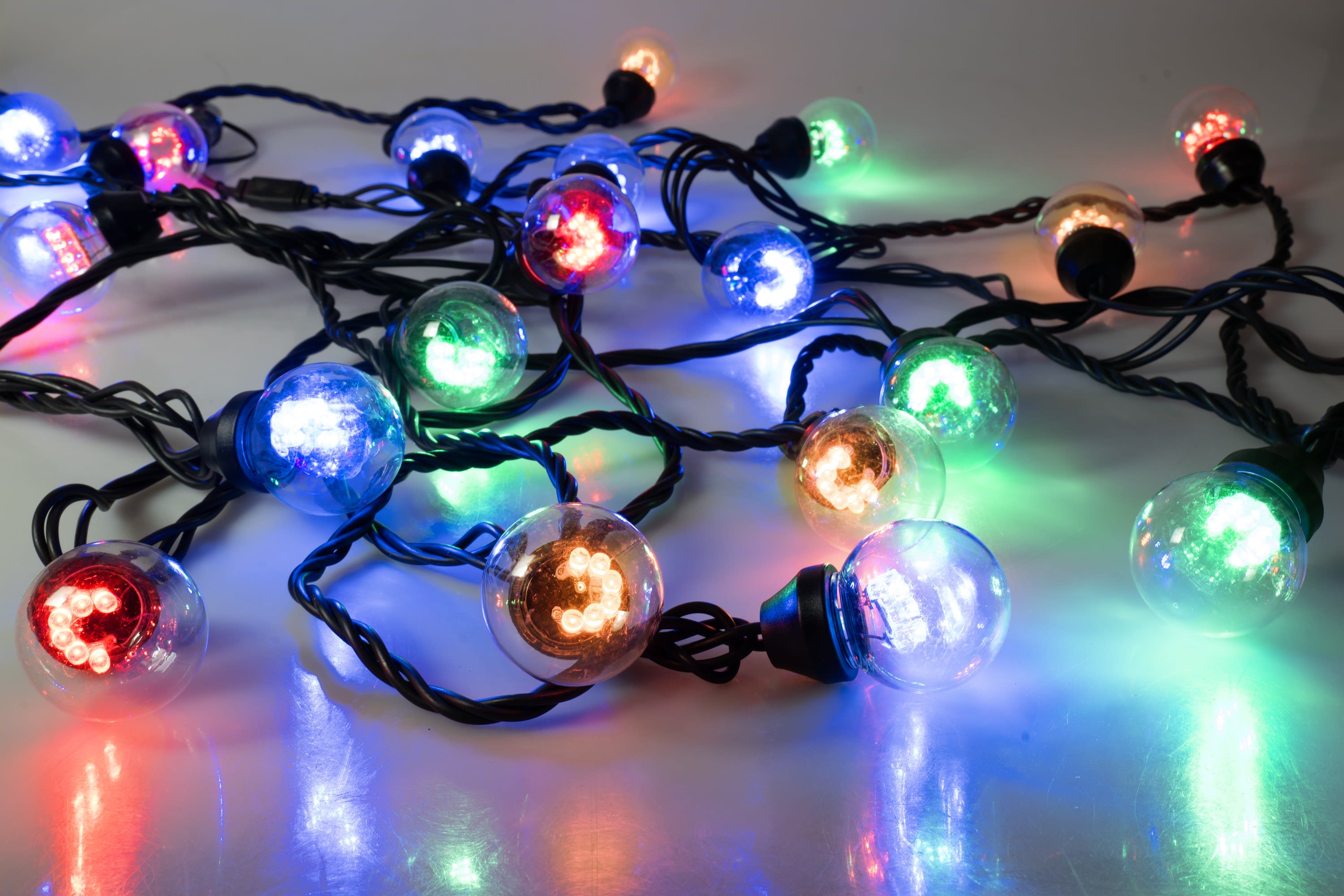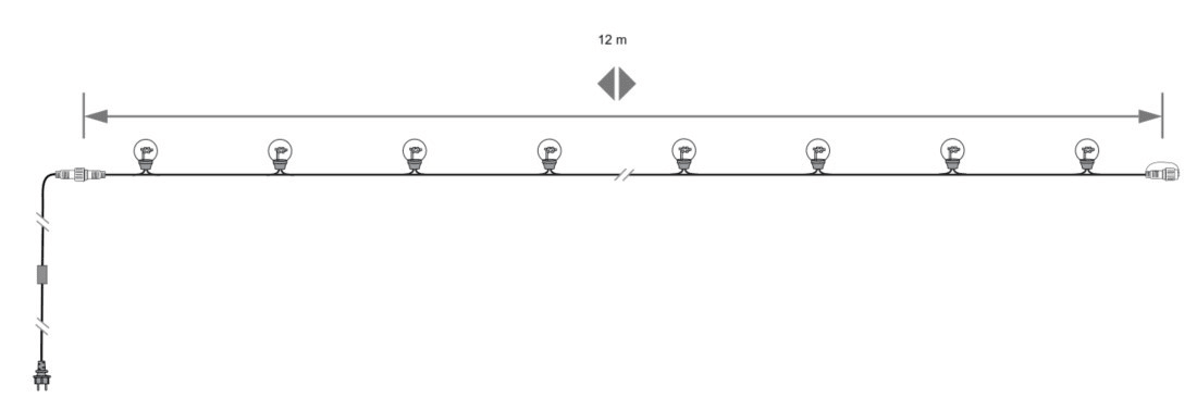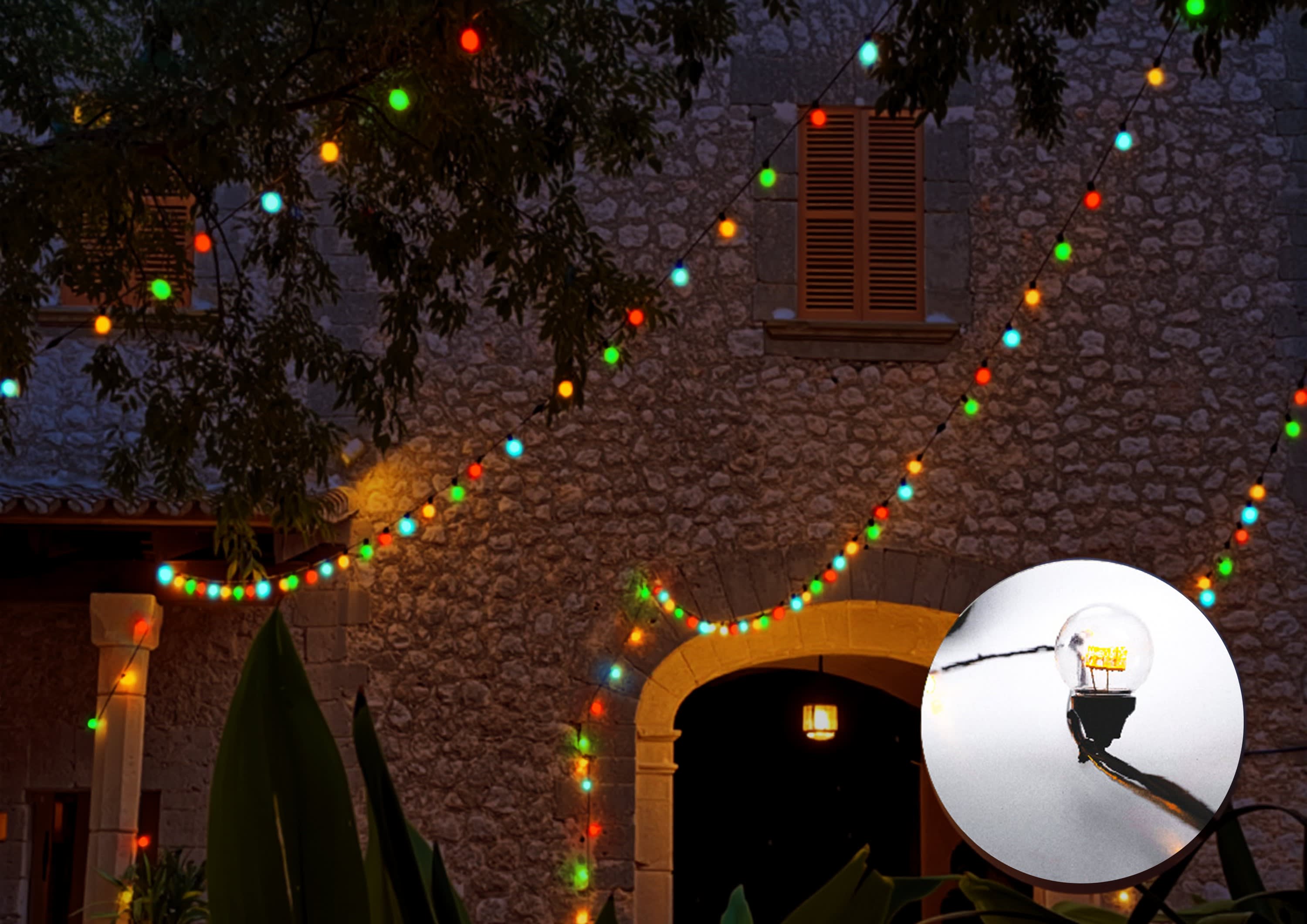 Guirlande LEDMOSPHERE couleur 12m - 230V 30 lampes multicolores (rouge / bleu / orange / vert)- Fixe - câble en caoutchouc noir -usage extérieur-compatible avec octoplus 230V- l'unité