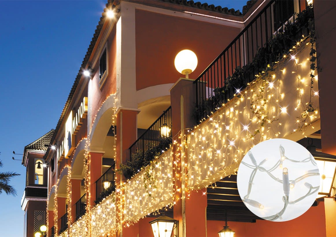 Rideau JOYLIGHT® led-230V-2m x 3m 540 led blanc chaud (led 100% officielles)-18 descentes-fixe câble caoutchouc blanc-usage extérieur l'unité