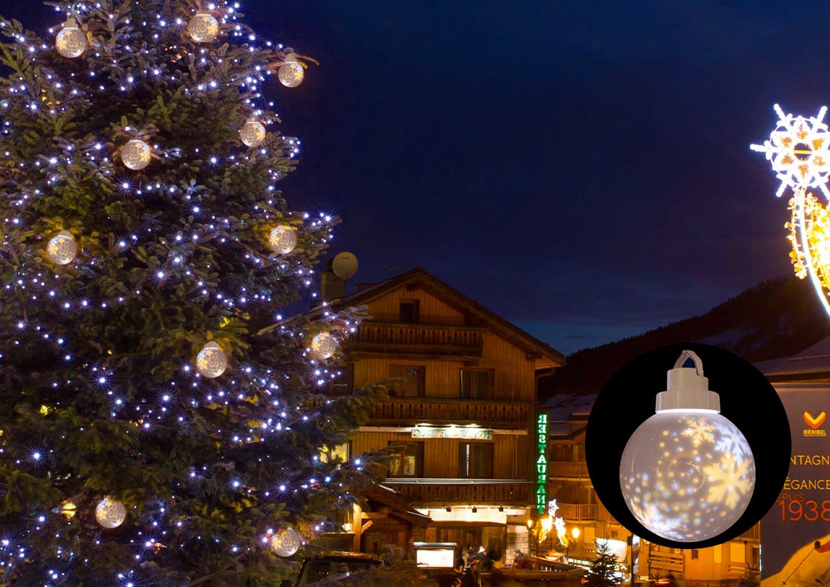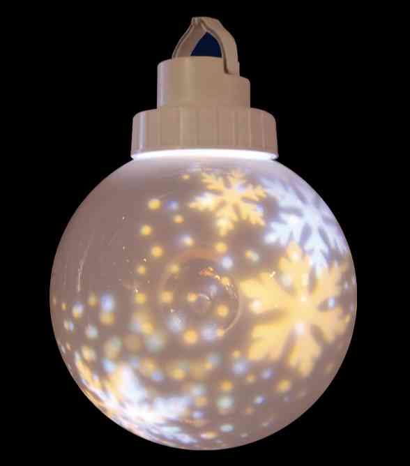 5 décorations à suspendre (ø20cm) - avec projection de flocons blanc pur + blanc chaud dans chaque sphère - collecteur 1,5m x 3m de cable par décoration - cable pvc noir - avec crochet de suspension pour chaque décoration - usage extérieur