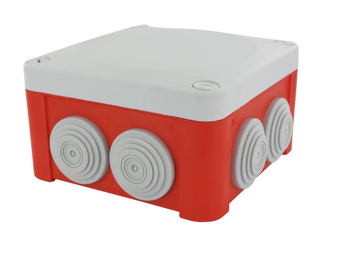 Boîte de dérivation étanche Optibox' rouge IP55 pour circuits de sécurité 960°100x100x52 avec tétines, avec couvercle à fermeture 1/4 de tour, corps en polypropylène et membranes en TPR, 9 entrées de 4 à 25 mm