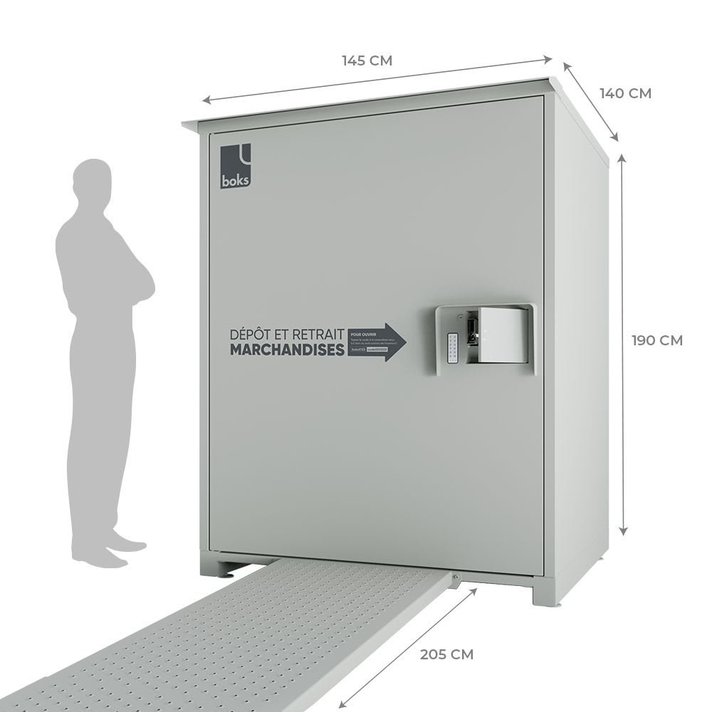 Avec sa rampe d'accès et près de 3m3 de volume utile, la BoksPRO XL est conçue pour accueillir une palette (EURO ou U.S.) jusqu'à 1t et 1,6m de hauteur. Elle est dédiée à la réception et à la sécurisation de marchandises palettisées ou hors-format à forte valeur. Comme le reste de la gamme, elle ne nécessite aucun raccordement électrique ou internet, et est déplaçable facilement à l'aide d'un transpalette ou chariot élévateur.