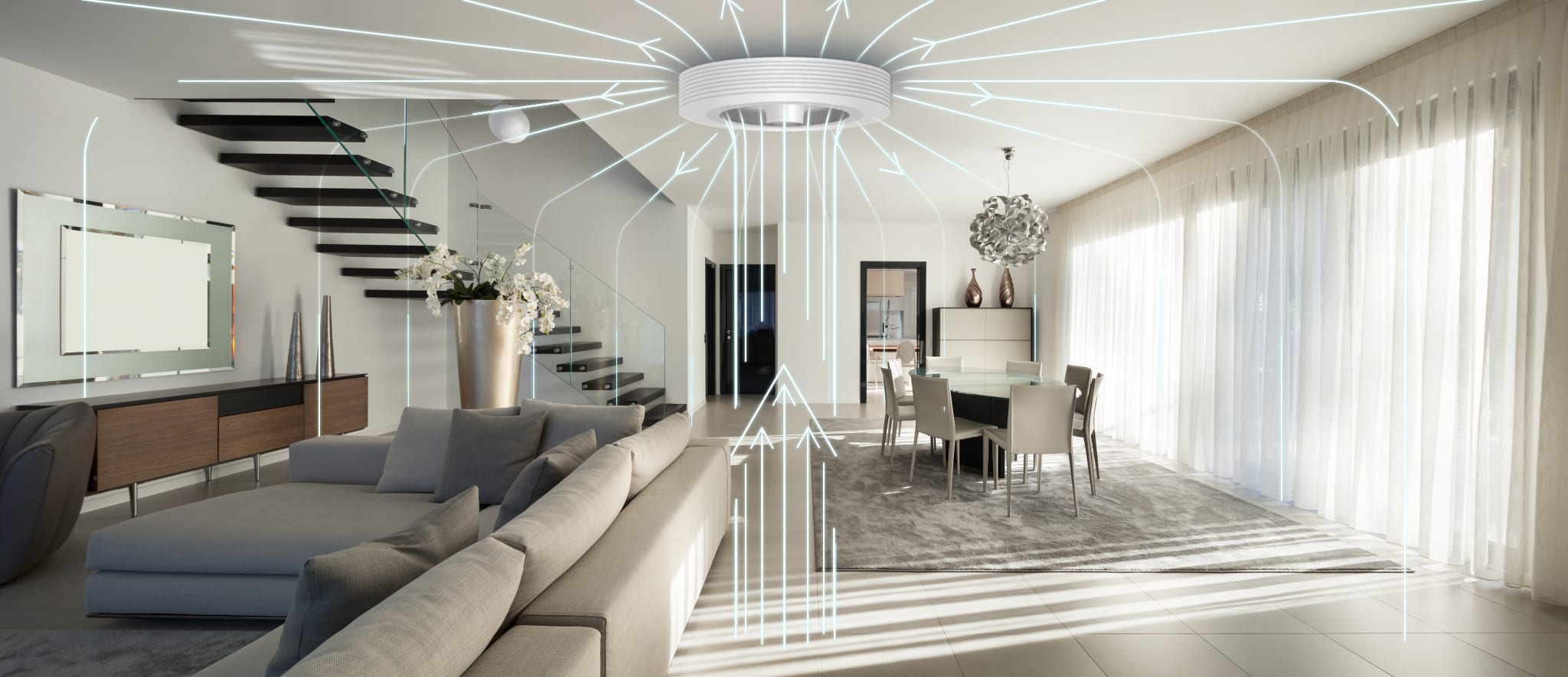 Brasseur d'air SANS PALES à effet Vortex EXHALE,ultra plat, répond à la réglementation NF EN CEI 60335-2-80, des 2,30m sous pales. Il répond également aux attentes en termes de calculs RE2020 (Degrès heures).