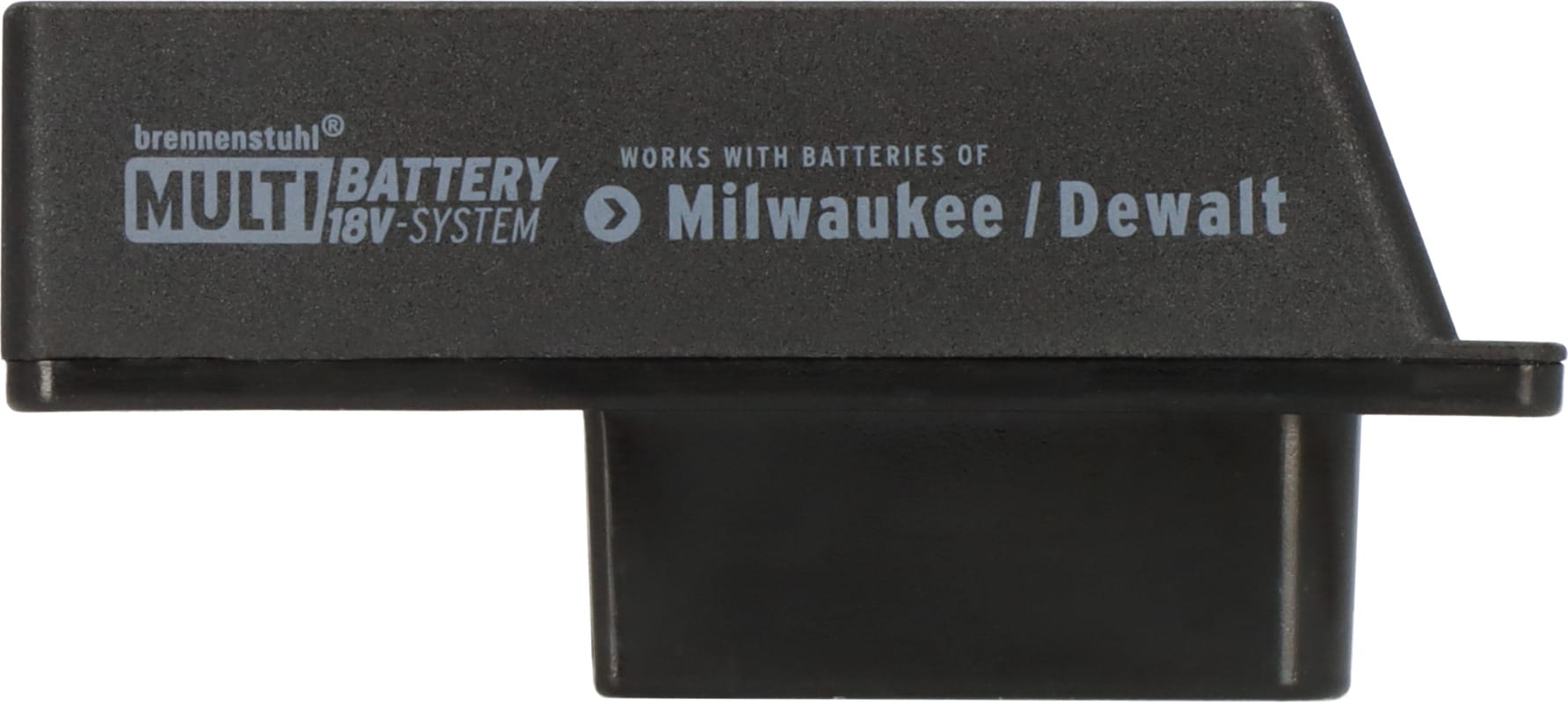 L'adaptateur Milwaukee / Dewalt du Multi Battery 18V System de brennenstuhl® permet l'utilisation de batteries 18V rechargeable sur l'un des projecteurs de chantier LED de la gamme Multi Battery. Fixez l'adaptateur, branchez la batterie et commencez à tra