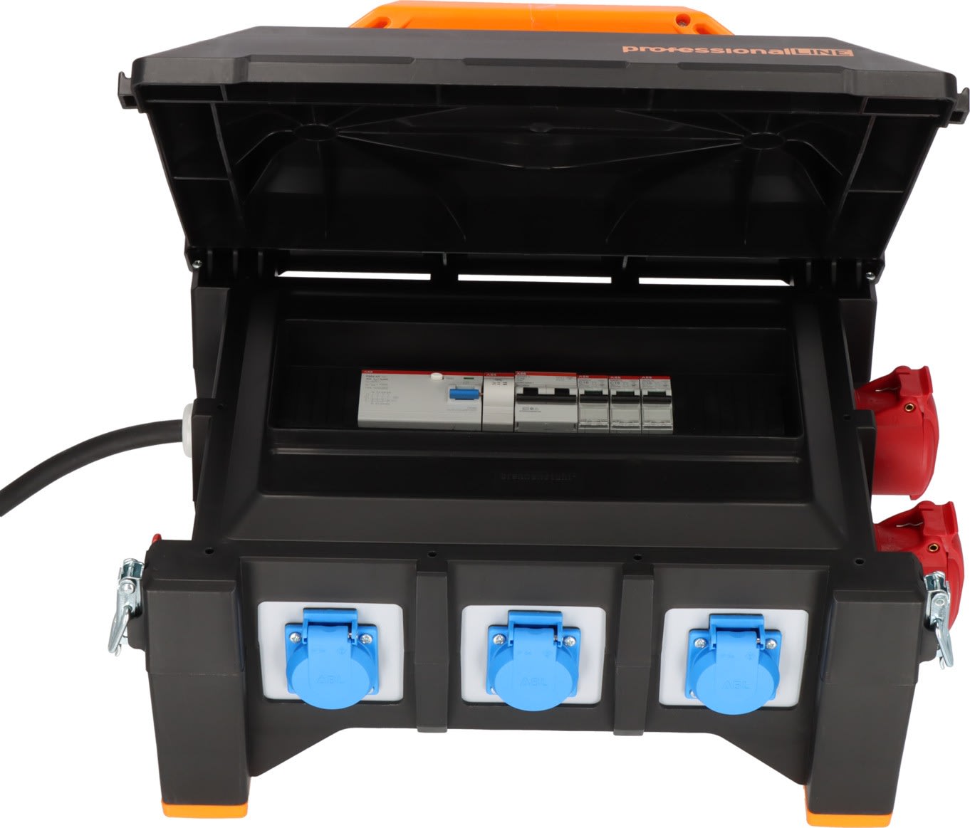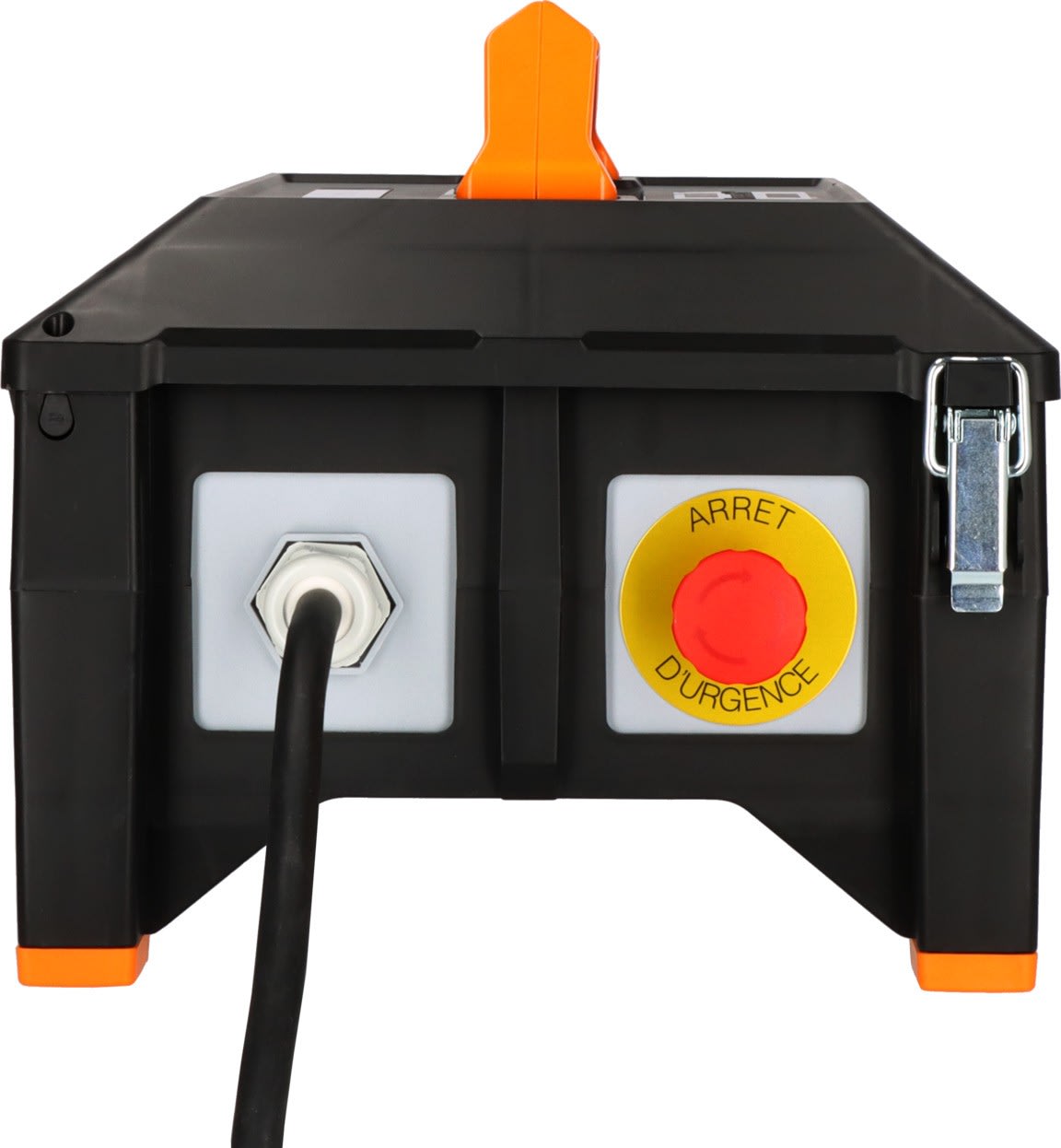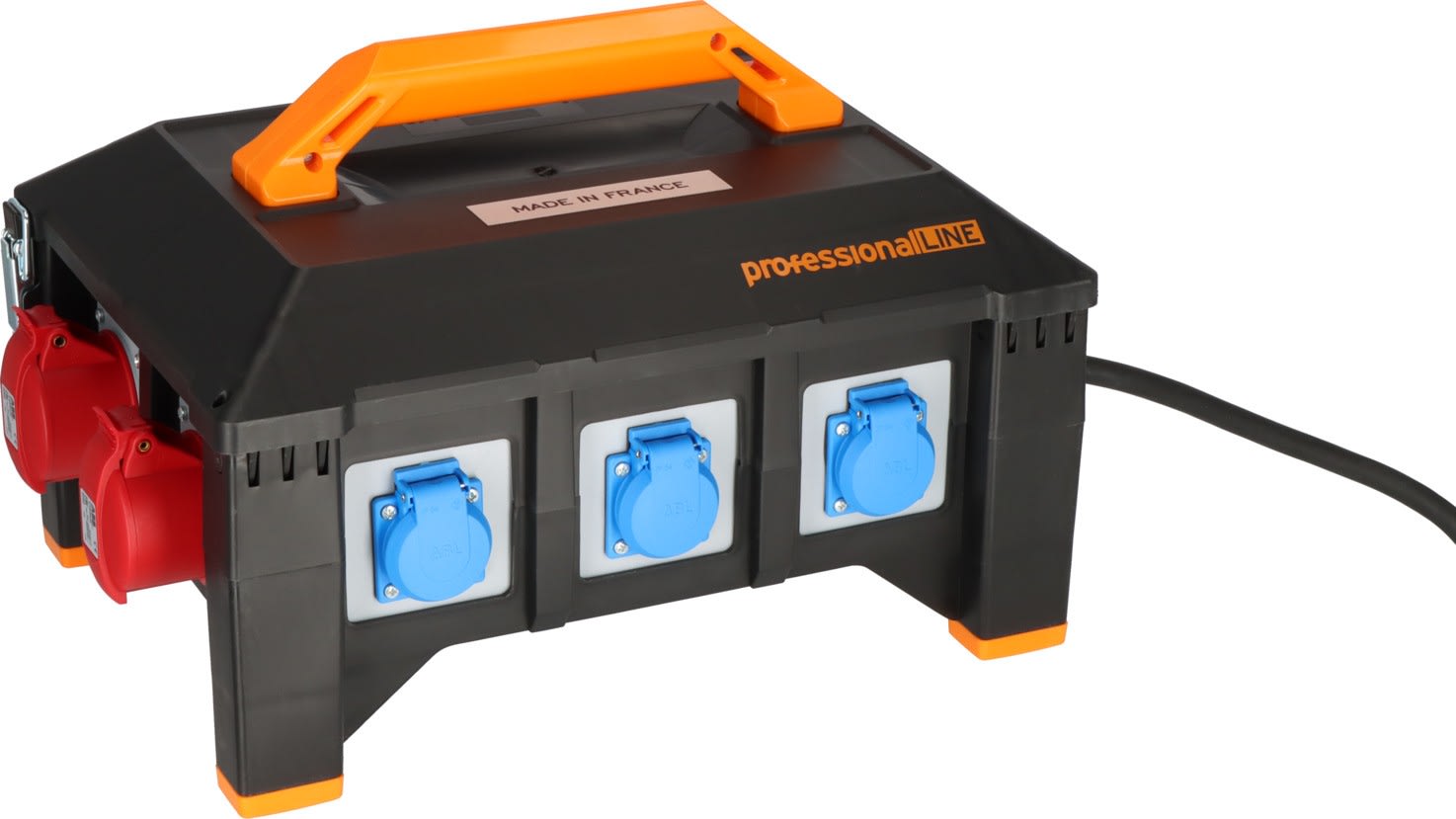 Le coffret de chantier professionalLINE CC 2T6M/16/AU de brennenstuhl®, doté de 2m de câble H07RN-F 5G2,5 performe par sa qualité et sa sécurité. Ce coffret électrique est pratique, robuste et adapté à un usage professionnel sur chantier et en atelie Coffret de chantier conçu pour une utilisation en extérieur, 2m de câble néoprène (H07RN-F 5G2,5) résistant aux hydrocarbures, boîtier protégé contre les projections d'eau de toutes directions (IP44) Coffret doté de: 1 bouton d'arrêt d'urgence, 1 interrupteur différentiel 30mA (230/415V 25A 4 pôles Type AC), disjoncteurs divisionnaires : 1x16A/415V 4 pôles Courbe C + 3x16A/230V 2 pôles Courbe C Tableau électrique provisoire pour atelier ou chantier, large poignée de transport, couvercle équipé de 2 fermetures à levier inoxydables et pieds en caoutchouc antidérapants - 11 KVA puissance max Emboîtement du coffret permettant la superposition de coffrets-2 prises de courant 3P+N+T 16A/415V et 6 prises de courant 2P+T 16A/230V avec clapets à fermeture automatique et 1 fiche 3P+N+T 16A/415V Coffret électrique développé avec un mélange de plastique/élastomère pour un usage professionnel et résistant aux conditions sur chantier difficiles de -30°C à +80°C (en extérieur comme en intérieur)