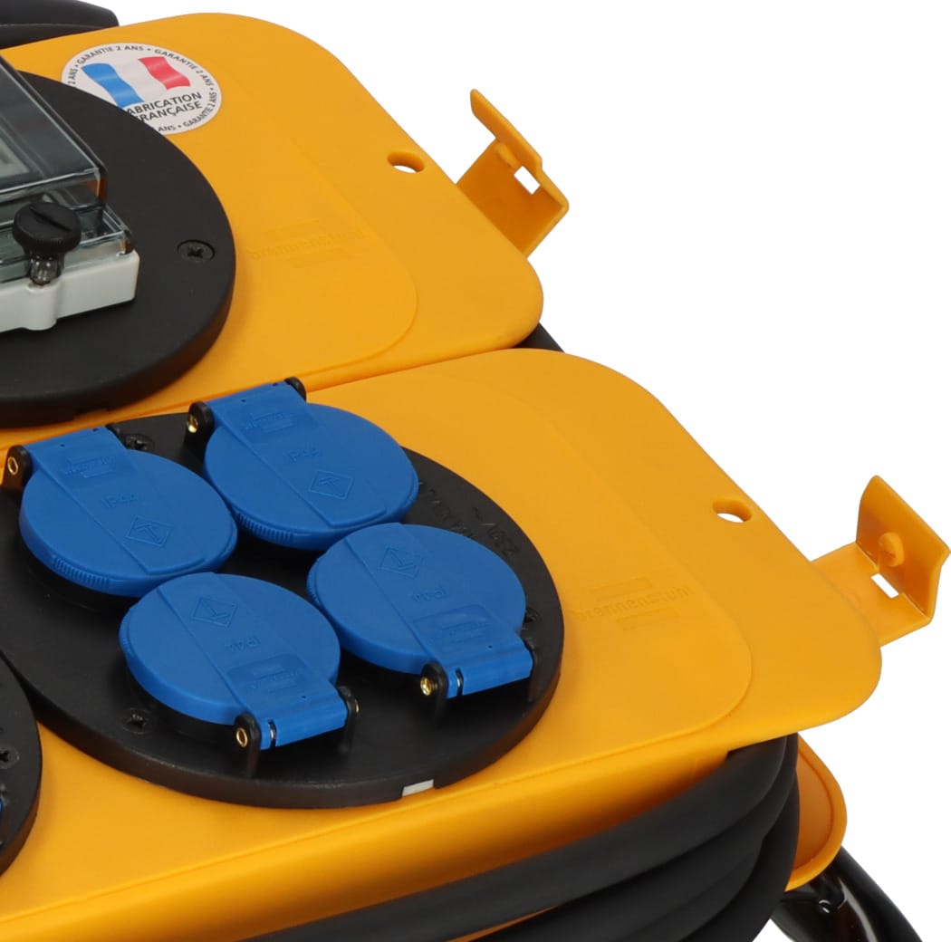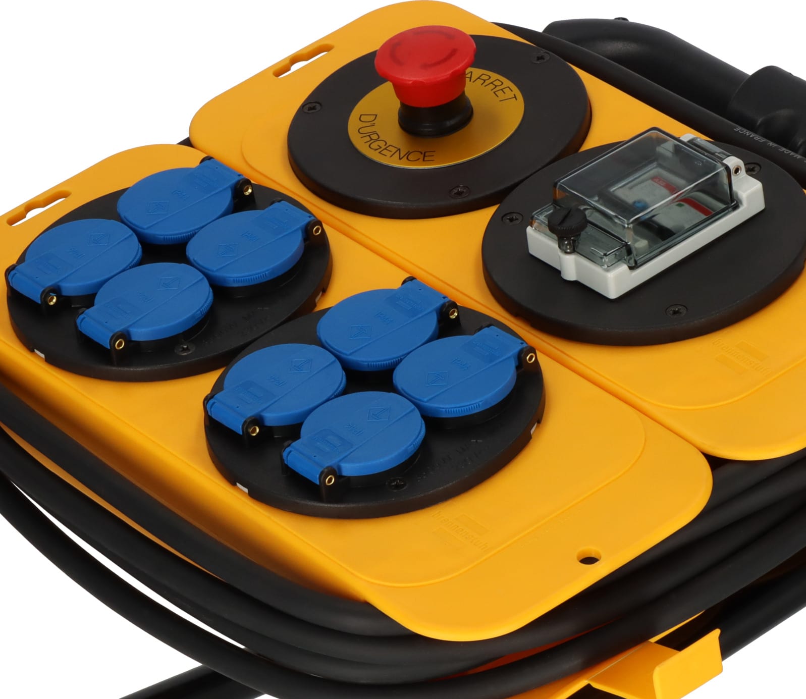 Le coffret électrique mobile SC 8M/16/AU de brennenstuhl®, équipé de 5m de câble H07RN-F 3G2,5, se différencie des coffrets de chantier standard par sa structure et son matériel. Ce tableau électrique portable est doté de huit prises de courant, d'un dis