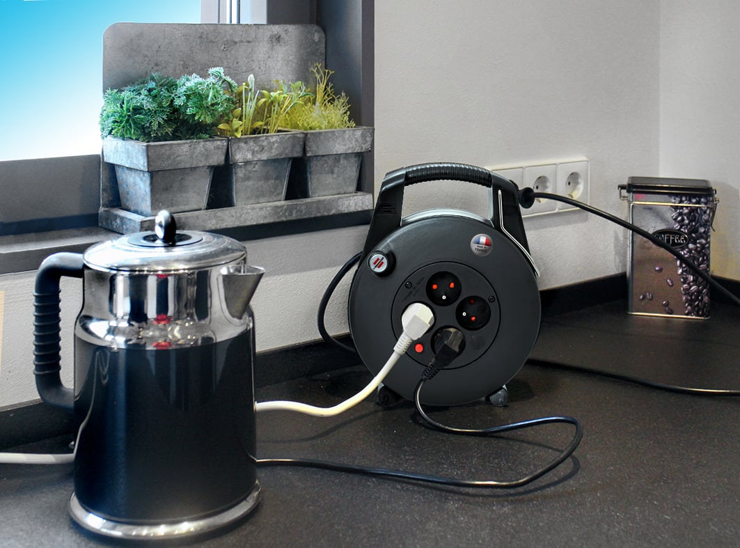 L'enrouleur de câble Confort-Line CL-L de brennenstuhl® est doté de 4 prises de courant avec disjoncteur thermique pour une puissance maximale de 2300W (câble déroulé). Le boîtier avec poignée de transport intégrée et deux pieds de socle assure toute la p