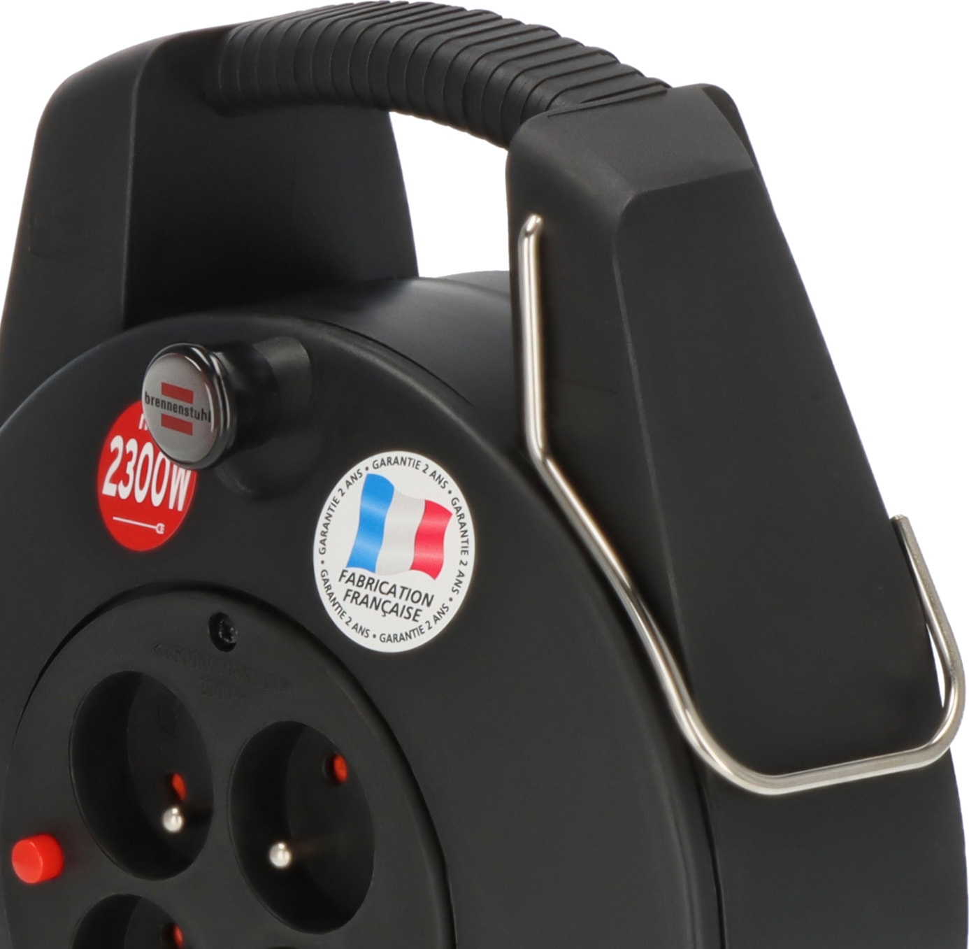 L'enrouleur de câble Confort-Line CL-XL de brennenstuhl® est doté de 4 prises de courant avec disjoncteur thermique pour une puissance maximale de 2300W (câble déroulé). Le boîtier avec poignée de transport intégrée et deux pieds de socle assure toute la