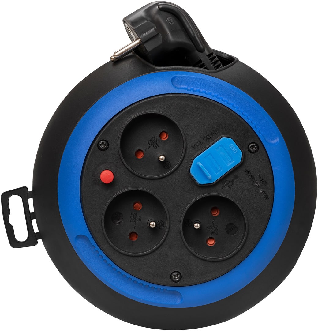 Brennenstuhl Enrouleur de câble Design-box CL-S avec USB / Petit enrouleur électrique 3 prises de courant et 2 prises-chargeur USB (3m H05VV-F, utilisation en intérieur, fabriqué en France) noir/bleu
